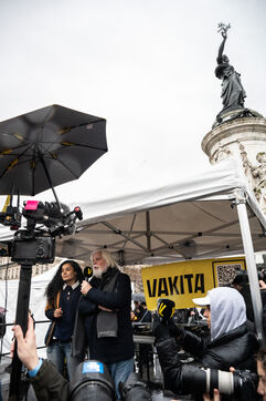 Paul Watson le fondateur de Sea Shepherd célèbre symboliquement sa libération avec ses soutiens sur la Place de la République lors d'un rassemblement à Paris en France le samedi 21 décembre 2024. Apres cinq mois en détention au Danemark le militant écologiste Paul Watson engagé pour la protection des baleines est arrivé a Paris en France le vendredi 20 décembre 2024 après le refus d'extradition vers le Japon.