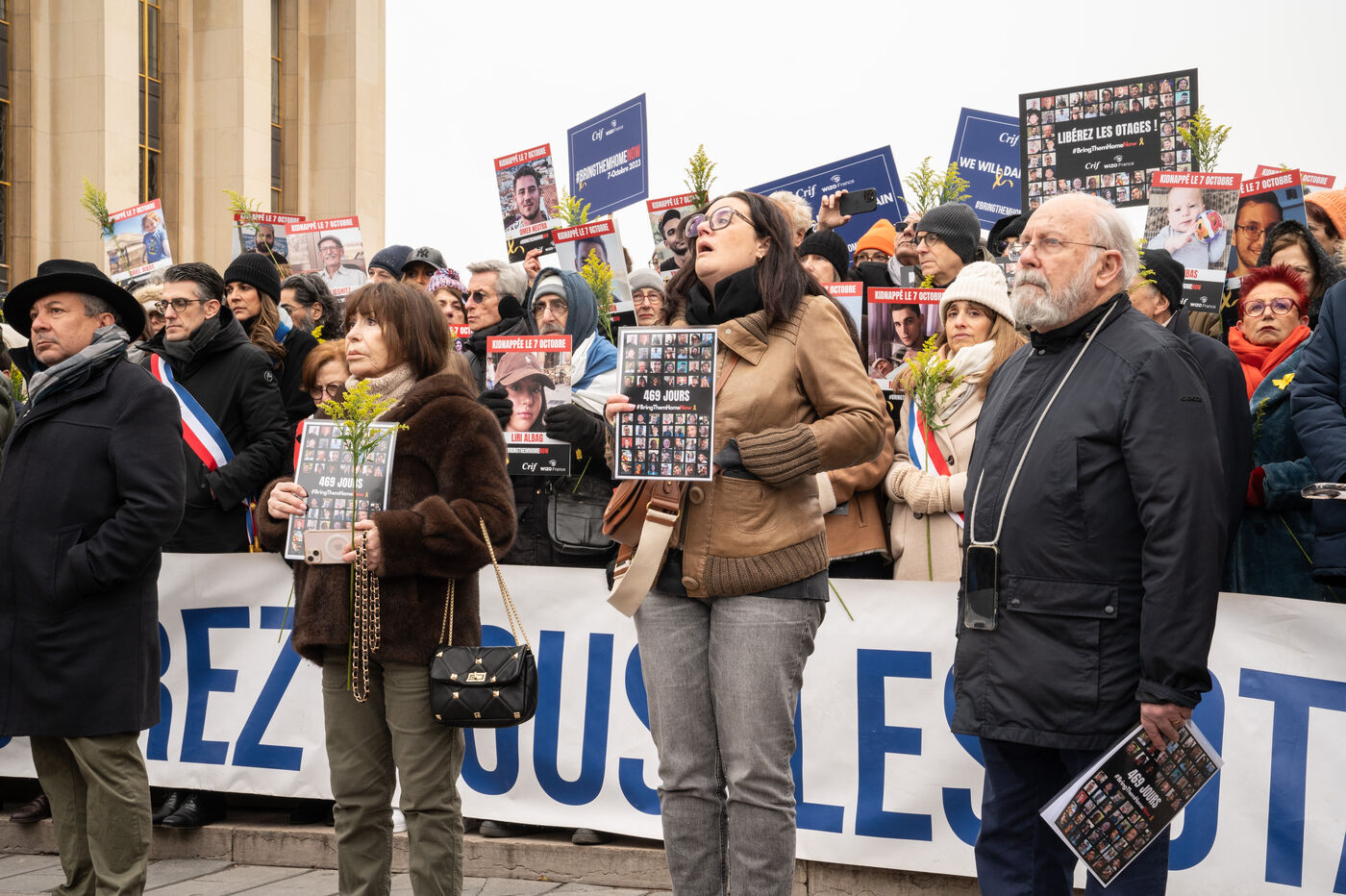 Depuis le début de la détention des otages qui a suivi l'attaque terroriste du Hamas le 7 octobre 2023, un rassemblement se tient tous les vendredi Place du Trocadero à Paris. Le rassemblement du 17 janvier 2025 marquait le 469éme jour de captivité à Gaza, à l'avant-veille d'un accord de cesser le feu devant aboutir à leur libération. Le rassemblement réunissait des personnalité et des personnes anonymes portant des pancartes avec l'inscription du hashtag BringThemHomeNow et les photos des visages des personnes encore détenues ou mortes en détention. Une pancarte montrait l'image de Donald Trump pouvant changer la donne au centre des enjeux de la libération des otages.