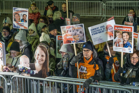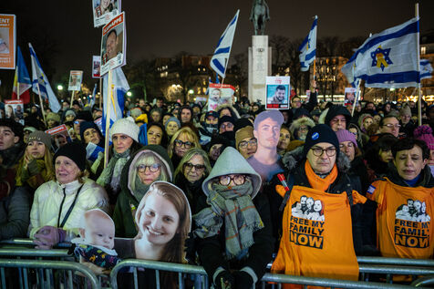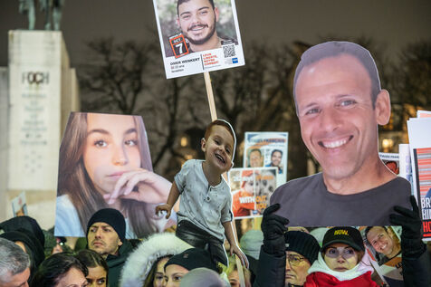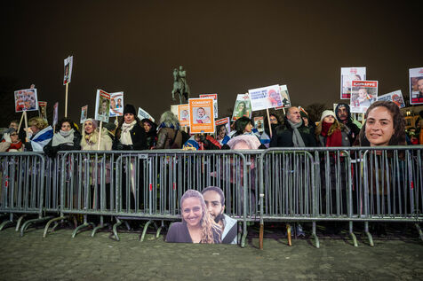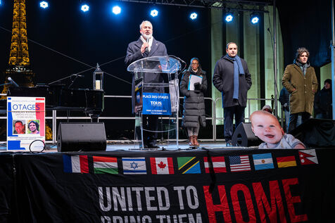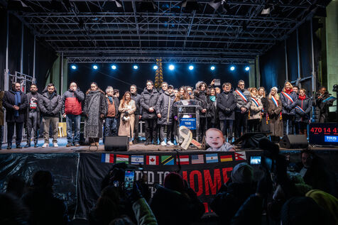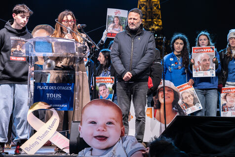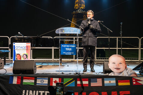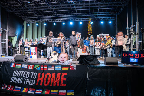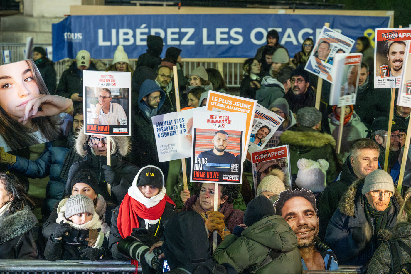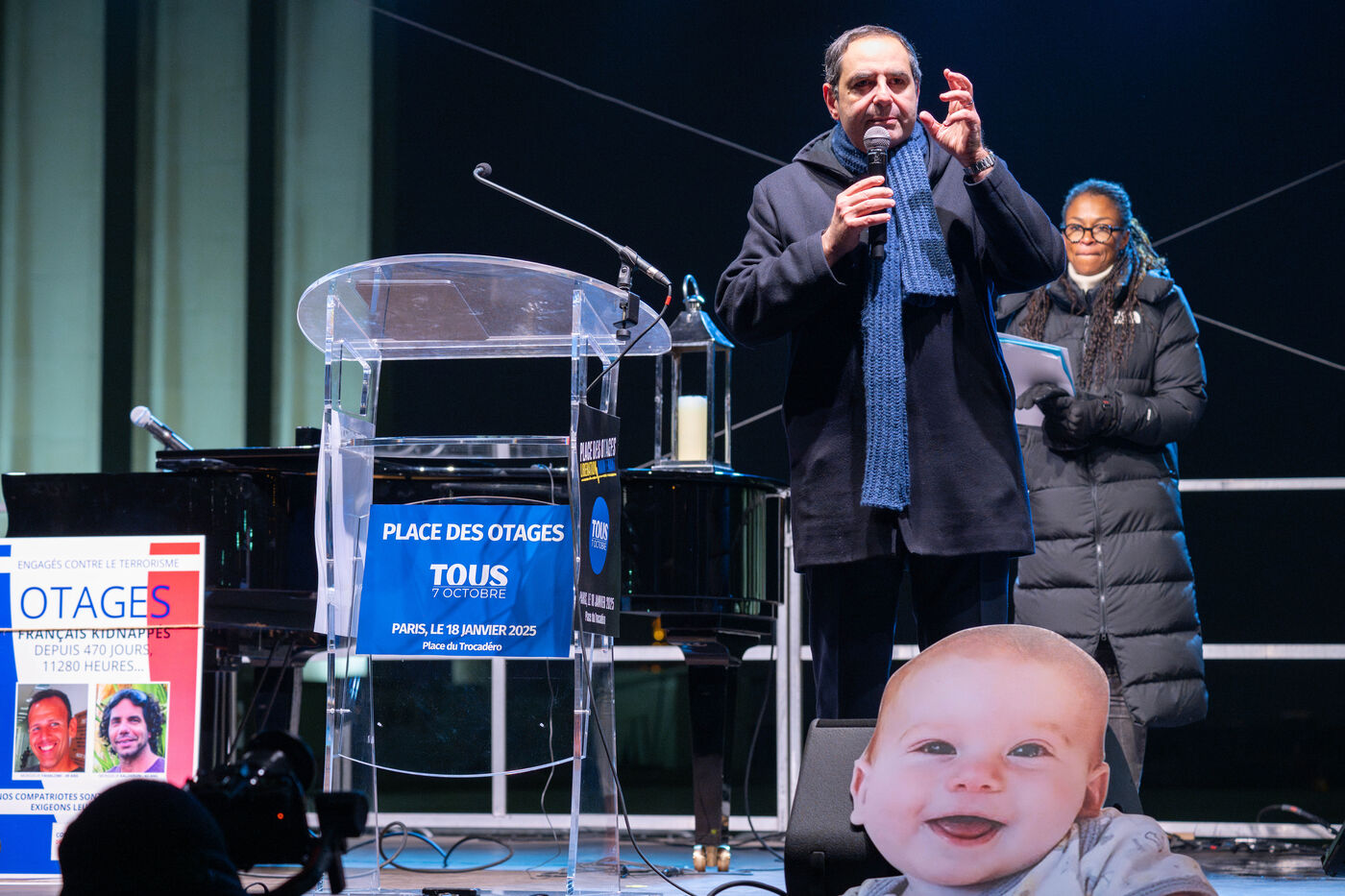 Gathering of anonymous people and celebrities at a re-enactment of Tel Aviv's Place des Otages at the Trocadéro in Paris. On the eve of the January 19 ceasefire, the event was organized by the NGO Tous 7 Octobre, with the support of the Forum des Otages, to support the families of the Hamas hostages and demand their release. Place des Otages is a public square in Tel Aviv, Israel, where the families of the hostages and their supporters have been gathering since the attack on October 7, 2023.