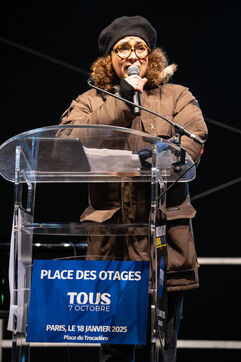 Rassemblement regroupant des anonymes et des personnalités lors d'une reconstitution au Trocadéro à Paris de la Place des Otages de Tel Aviv. A la veille du cesser le feu du 19 janvier, il s'agissait lors de cet évènement pour l'ONG Tous 7 Octobre avec le soutien du Forum des Otages de soutenir les familles des otages du Hamas et réclamer leur libération. La Place des Otages est une place publique de Tel Aviv en Israël où les familles des otages et leurs sympathisants se rassemblent depuis l'attaque du 7 octobre 2023.