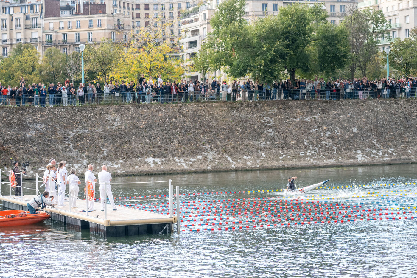 During the Open EDF sur Seine competition, French athlete Tony Estanguet, three-time Olympic canoeing champion, and Maxime Grousset, French world champion in the 100m butterfly, took on a challenge combining their two sporting specialties to lead a sprint race over 100 meters. This event was part of the first edition of the Sports Festival announced by French President Emmanuel Macron during the Paris 2024 Olympic Games, held on the Grenelle basin in the Seine in Paris. The event was held in the presence of Marie Barsacq, Minister of Sports, Youth and Community Life, and Amélie Oudéa-Castéra, President of the French National Olympic and Sports Committee.