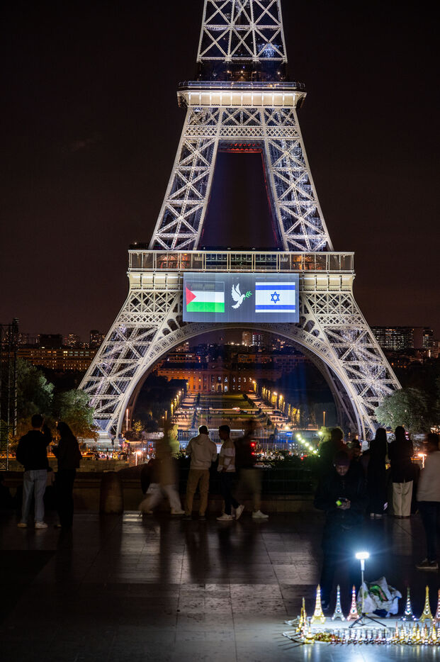 La projection de la mairie de Paris du 21 septembre 2025 sur la Tour Eiffel d'une image réunissant les drapeaux palestinien (G) et israélien (D) avec une colombe tenant un rameau d'olivier, intervient a la veille de la réunion de l'assemblée générale de lONU consacrée a la reconnaissance de l'Etat de Palestine par plusieurs pays dont la France.