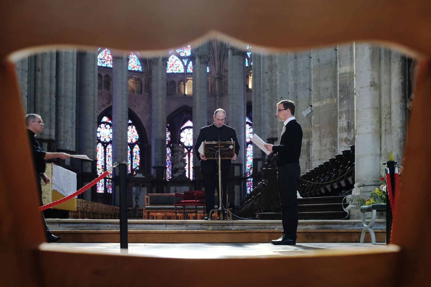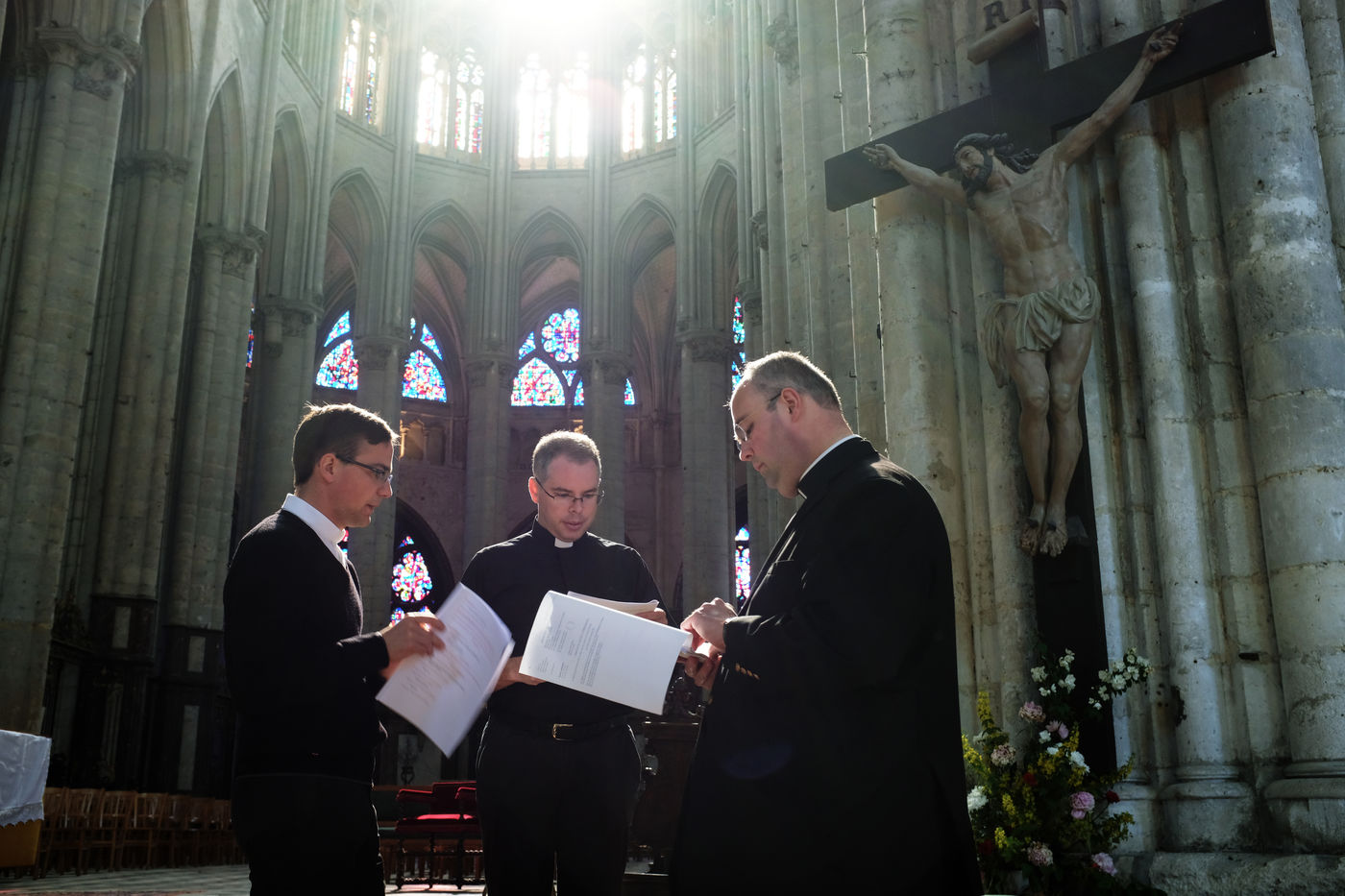 Sous la nef inachevée de la cathedrale de Beauvais, Augustin Chartier et deux prêtres cérémoniaires préparent son ordination qui aura lieu le surlendemain.