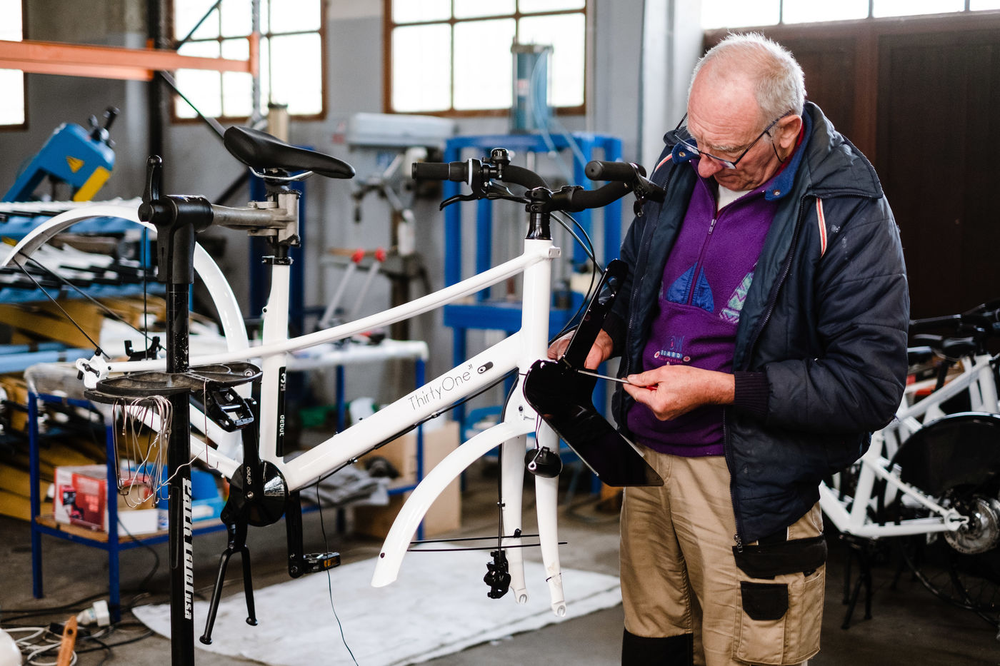 En 2014, Christophe Baeza a créé une entreprise de fabrication de vélos électriques en France, Thirty One Bikes, grâce notamment au soutien de la région Occitanie. Aujourd'hui, sa petite entreprise est en pleine expansion et le chef d'entreprise va donc logiquement augmenter ses recrutements pour pouvoir répondre à la forte demande qui s'est accrue avec les confinements successifs et la pandémie de coronavirus. Jean-Marie, salarié, travaille sur la chaîne d'assemblage des vélos et peut assembler un vélo en une heure environ. A Villeneuve de Riviere, Haute-Garonne, le 6 avril 2021.