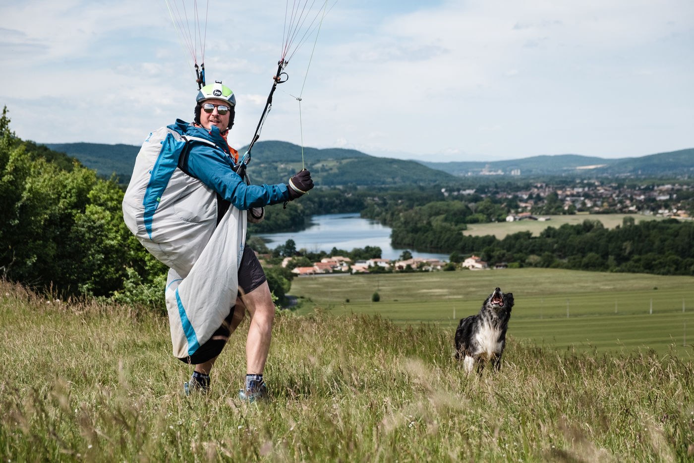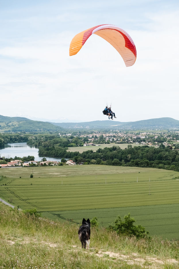 Portrait of paraglider Thibaut Vargas. He regularly participates in international competitions and is one of the top three paragliders in the Pyrenees. On this day he is training above the Garonne river and tries to stay in the air as long as possible despite the unfavourable winds. He also shows his passion to curious people and friends in the south west of France by giving them a tandem flight.