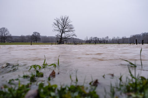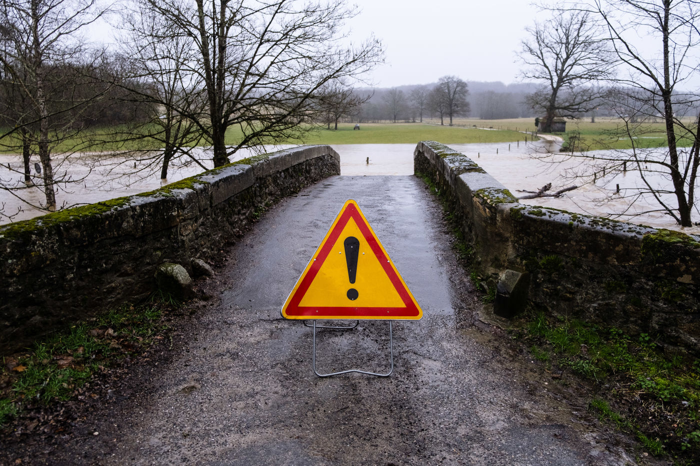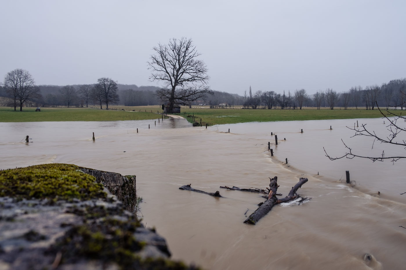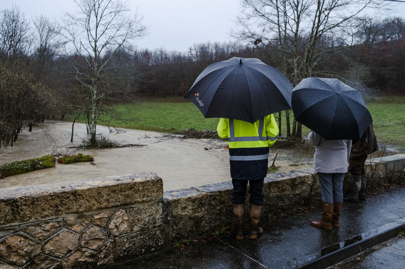 France, Occitanie, Haute-Garonne, Cassagne, 2022-01-10. Fort épisode de pluie dans le sud ouest de la France. Certaines routes du village sont fermées d'accès car les cours d'eau sont en crue. Les villageois viennent observer les inondations depuis les ponts.