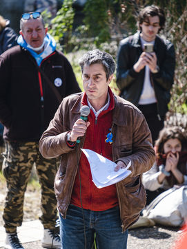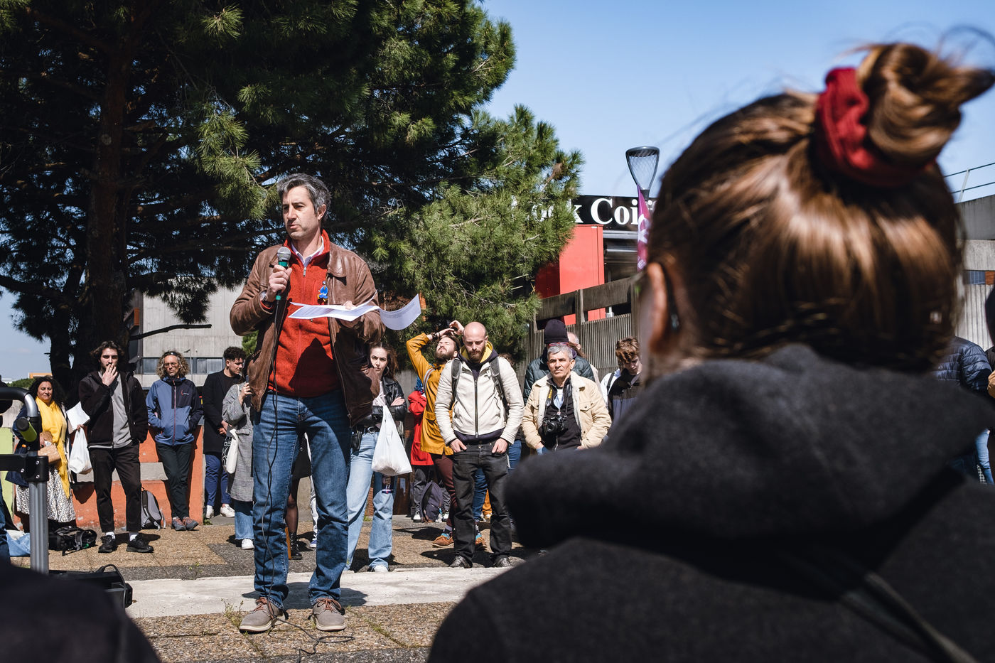 France, Toulouse, Université Jean Jaurès (Mirail), 2022-03-23. À l'approche du premier tour des élections présidentielles 2022, le député de la France Insoumise (LFI), François Ruffin, soutien du candidat Jean-Luc Mélenchon vient tenir un meeting. Tout proche de l'Université, il adresse notamment son discours à la jeunesse toulousaine en abordant le difficile mais important sujet de la précarité étudiante.