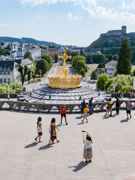 Déambulation dans la ville de Lourdes. Illustrations du sanctuaire, des rues commerçantes et de son chateau. Un été à Lourdes.
