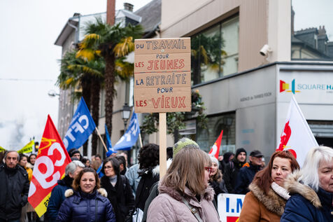 Manifestation dans le cadre de la journée nationale de grèves et de rassemblements pour protester contre un projet de reforme visant à faire passer l'âge de la retraite de 62 à 64 ans. France,Tarbes, 2023-02-07.