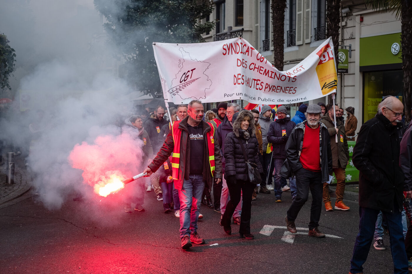 Demonstration as part of a national day of strikes and rallies to protest against a proposed reform to raise the retirement age from 62 to 64. France,Tarbes, 2023-02-07.