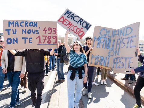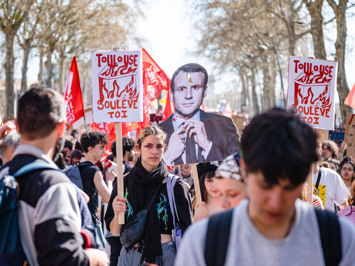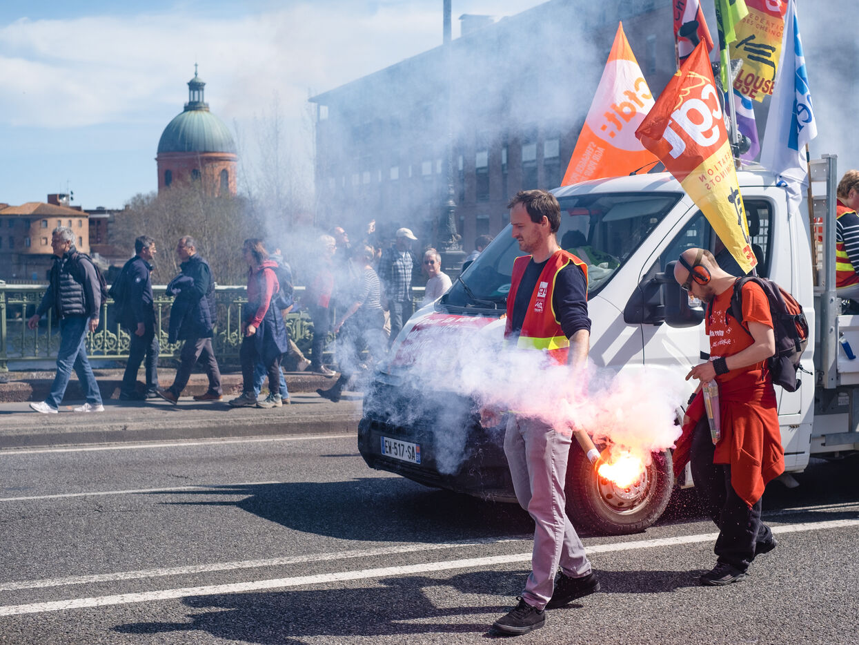 A demonstration as part of a national day of strikes and rallies to protest against a proposed reform to raise the retirement age from 62 to 64. France,Toulouse, 2023-03-28.