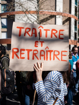Manifestation dans le cadre de la journée nationale de grèves et de rassemblements pour protester contre un projet de reforme visant à faire passer l'âge de la retraite de 62 à 64 ans. France,Toulouse, 2023-03-28.