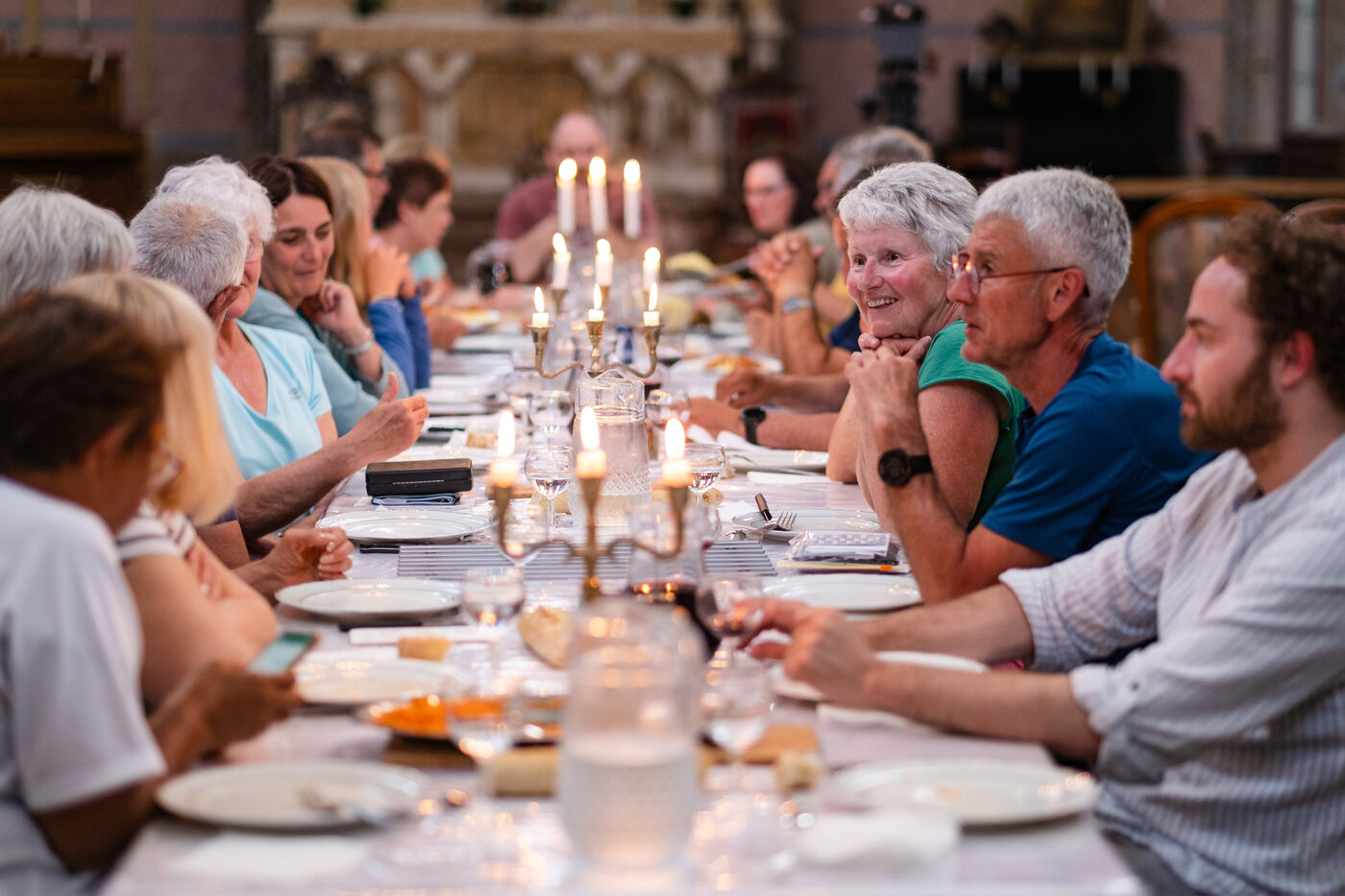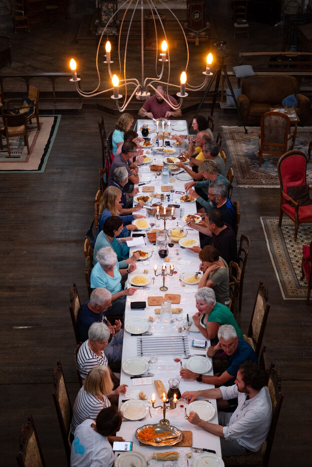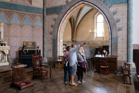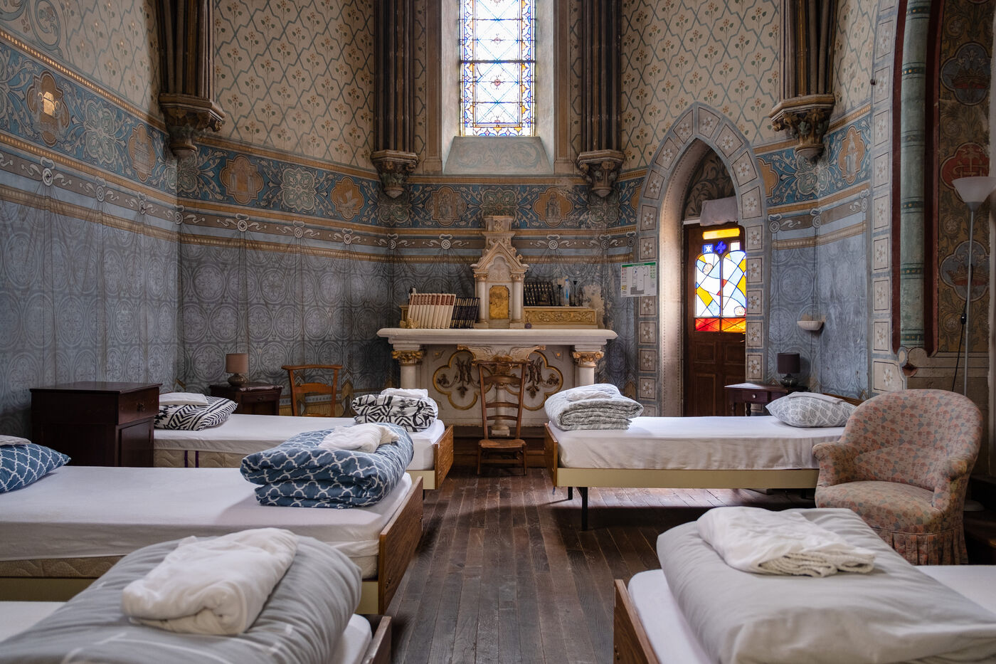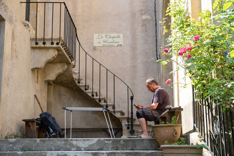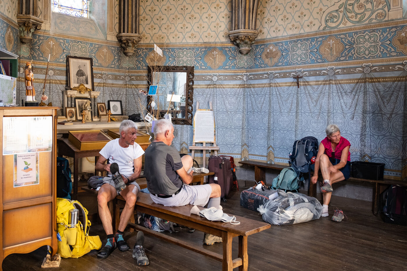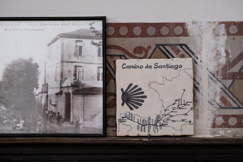 "Marie-Noëlle, who has just dropped off her walking shoes and walking stick at the reception desk of the Ursulines chapel, now converted into a stopover gîte, declares straight away: "This place is a challenge... just as the Pilgrim's Way to Santiago de Compostela is a challenge to us! It's 4pm on this late May afternoon, and the pilgrims are starting to arrive after a final steep climb on the outskirts of Aire-sur-l'Adour (Landes). "You won't have to climb it tomorrow morning," Didier Jouaret kindly consoles the out-of-breath pilgrims. He is the proud owner of this chapel, which once belonged to the teaching order of Ursuline nuns but was desecrated in 1973, and which he bought from a private individual in 2017. From the moment you enter the north side chapel, splendid nineteenth-century murals draw a trompe-l'?il curtain of blue and gold along the walls.