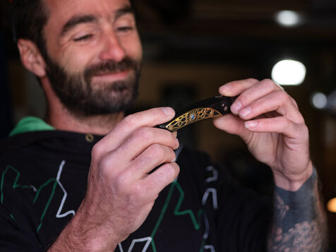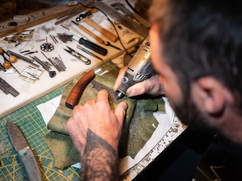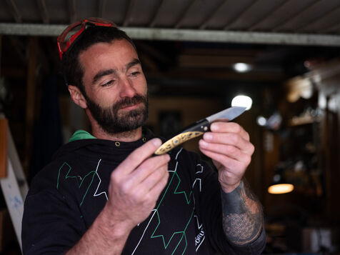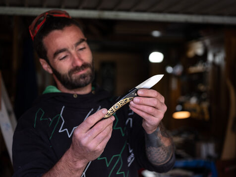 The shelves are crammed with various types of wood, Damascus steel blades, raw materials and carpentry and goldsmithing equipment, from small milling cutters to large cutting and polishing machines. On his workbench, a few pieces in the process of being finished, all these unique models respond to orders placed by his customers. The cutler started his business in 2019. His father-in-law used to work on shepherd's knives in the evenings, and his mother-in-law gave him a box with a few pieces of wood inside on which he began to practise.
