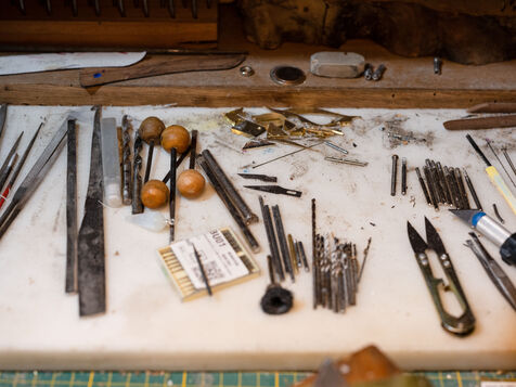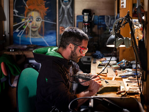 Les étagères fourmillent d'essences de bois diverses, de lames en acier de Damas, de matières premières et de matériel de menuiserie et d'orfèvrerie, allant de petites fraises à de grosses machines pour couper et polir. Sur son établi, quelques pièces en cours de finition, tous ces modèles uniques répondent à des commandes passées par ses clients. Le coutelier a débuté son activité en 2019. C'est son beau-père qui travaillait des couteaux de bergers le soir, sa belle-mère lui a confié une boîte avec quelques bouts de bois à l'intérieur sur lesquels il a commencé à s'exercer.