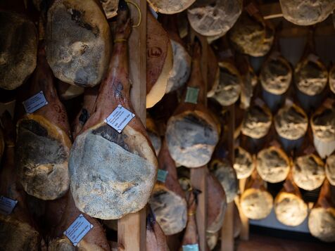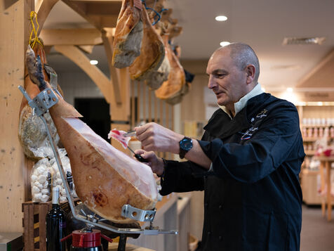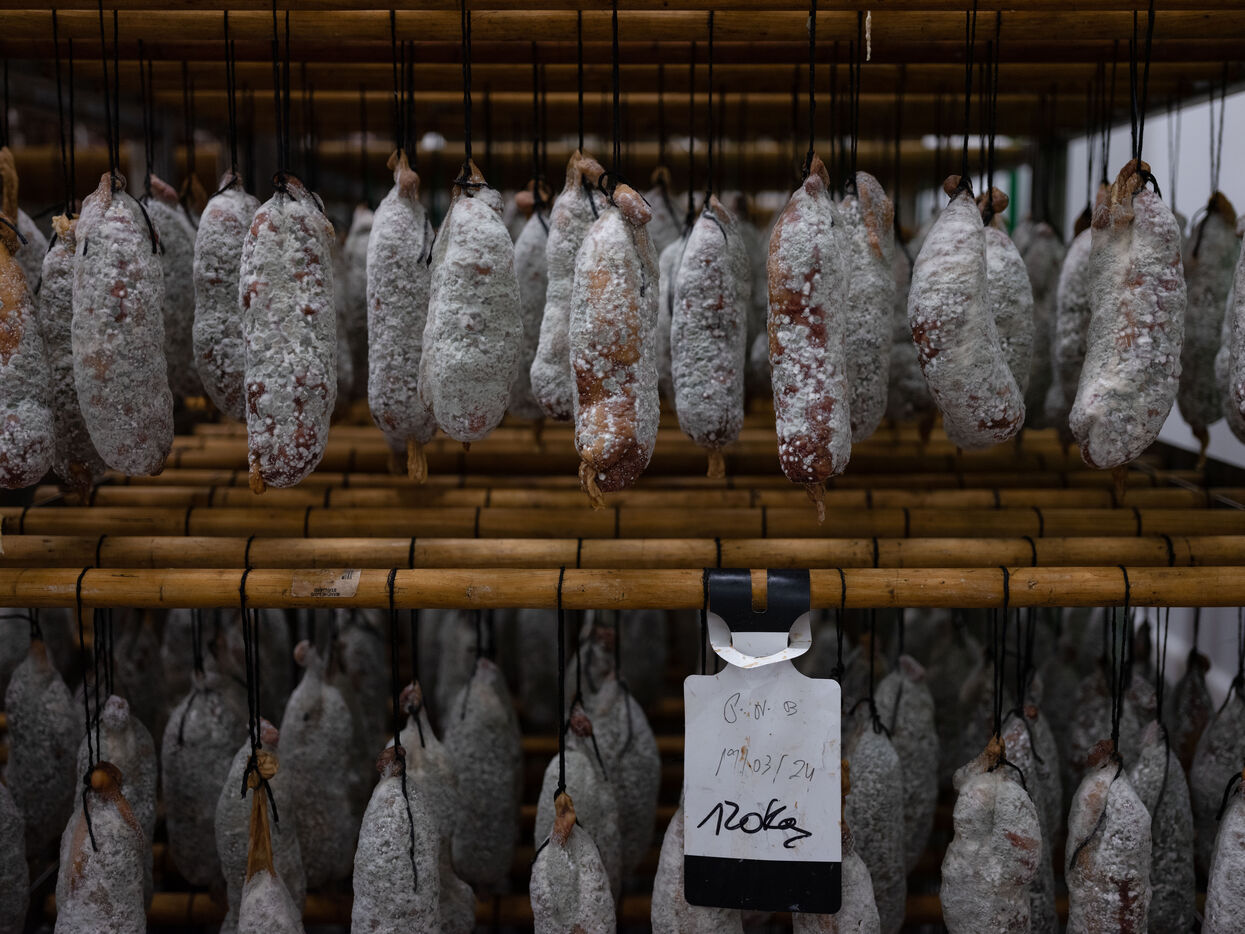 From a small delicatessen in Argelès-Gazost, Pierre Sajous' company, now based in Beaucens, produces up to 350 tonnes of finished products every year. In its maturing cellar, between 800 and 1,000 black Bigorre hams are aged.