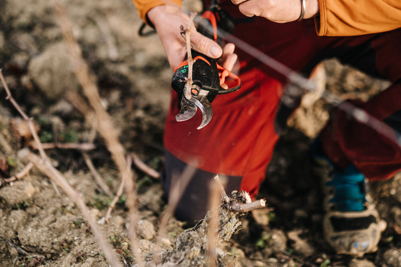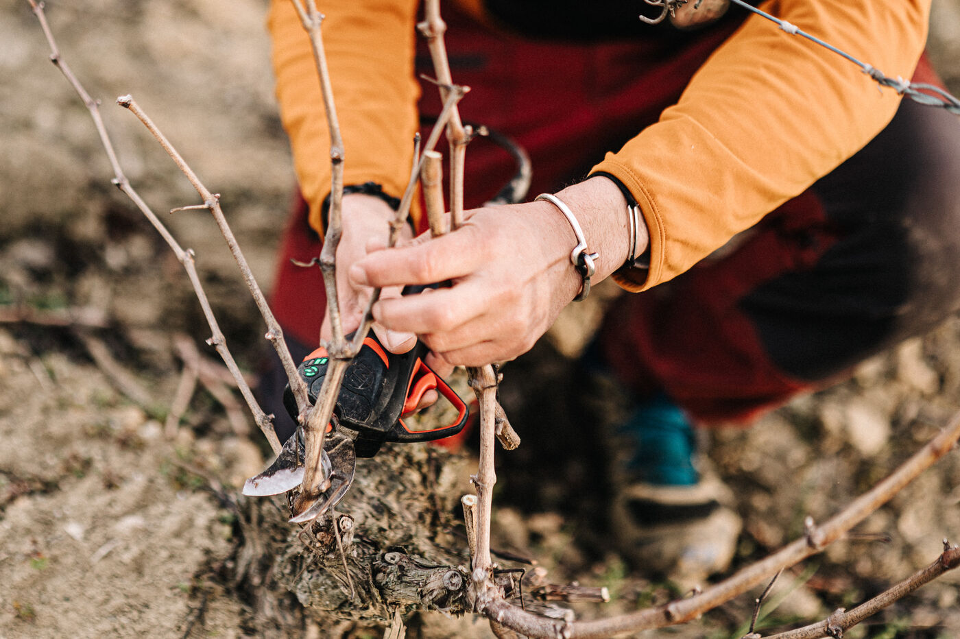 Frédéric Palacios du Domainde de mon Père (AOP Malepère) taille la vigne. Avec son approche de la viticulture il est un des précurseurs dans le monde des vins natures dans l'Aude.