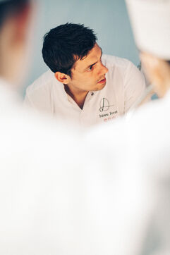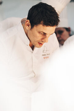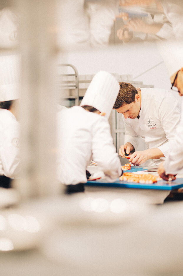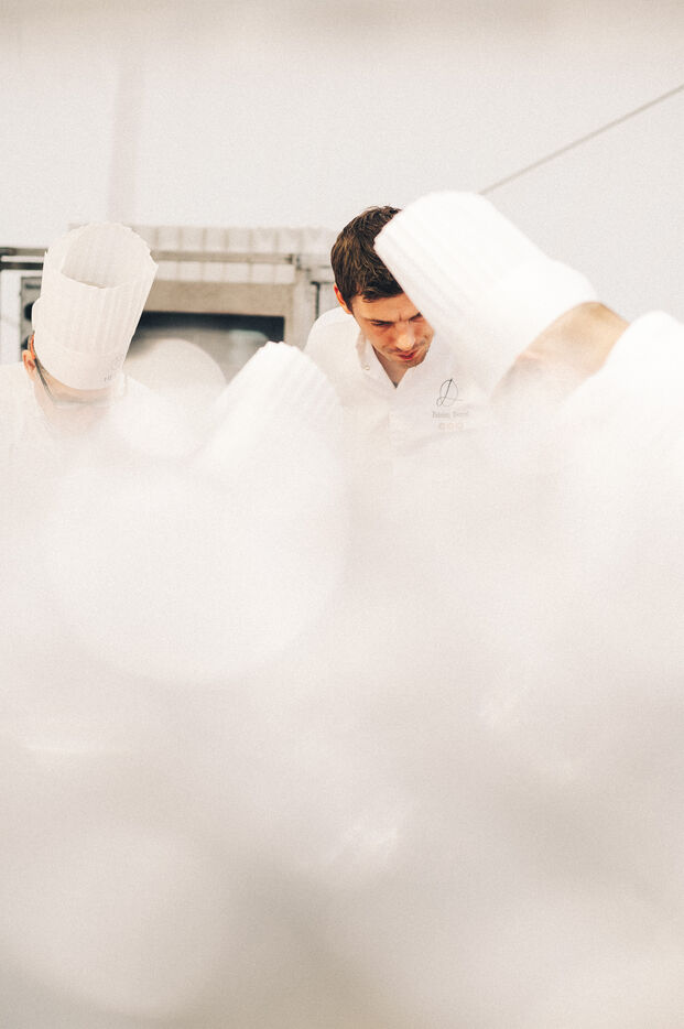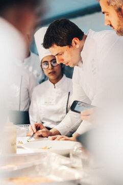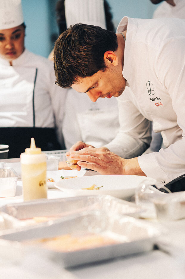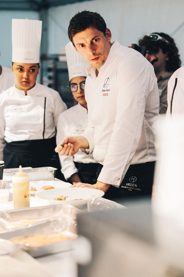 Chef Fabien Ferré, 3 Michelin stars, in full concentration at the Toques et Clochers 2025 gastronomic meal in Limoux.