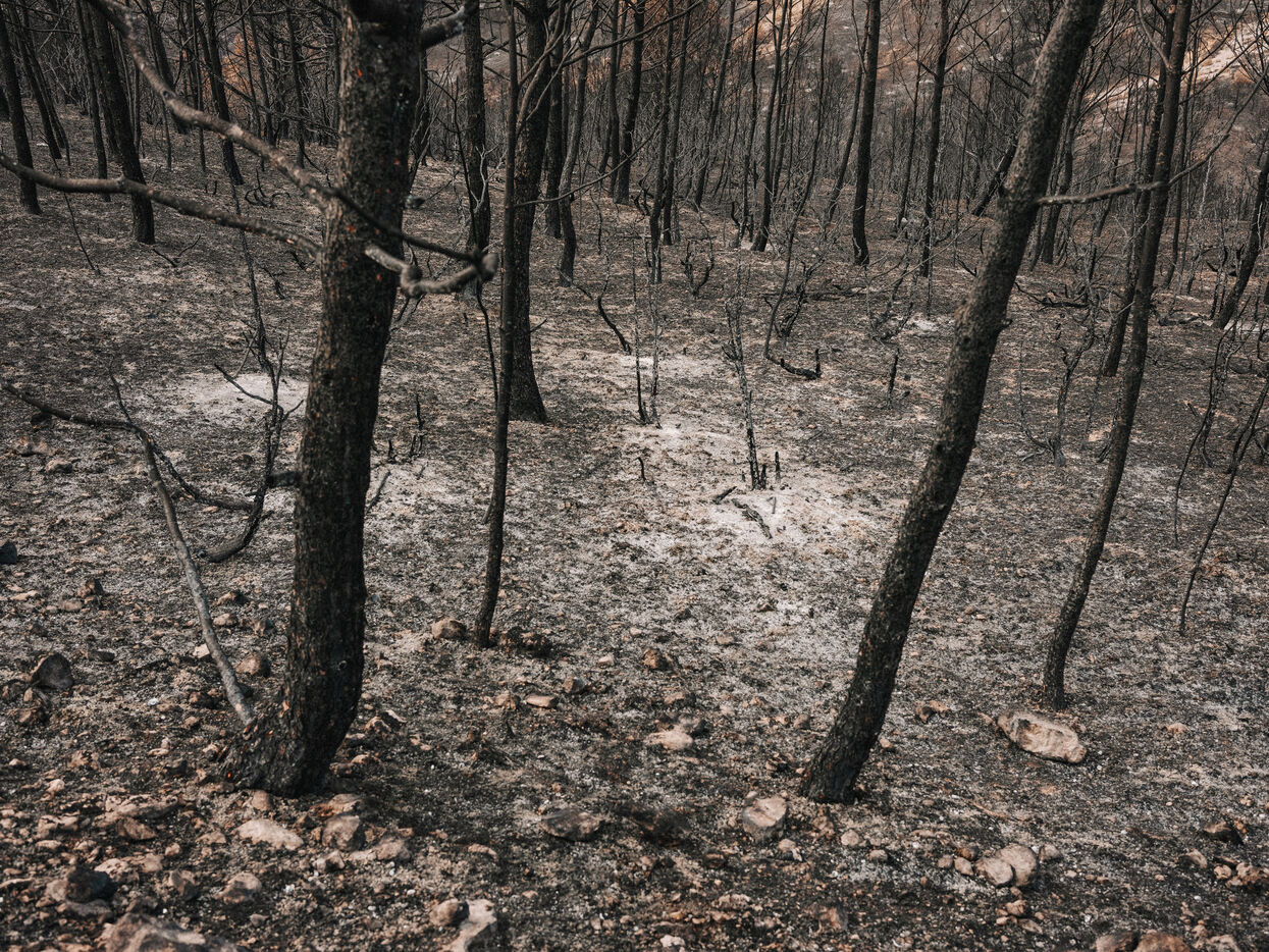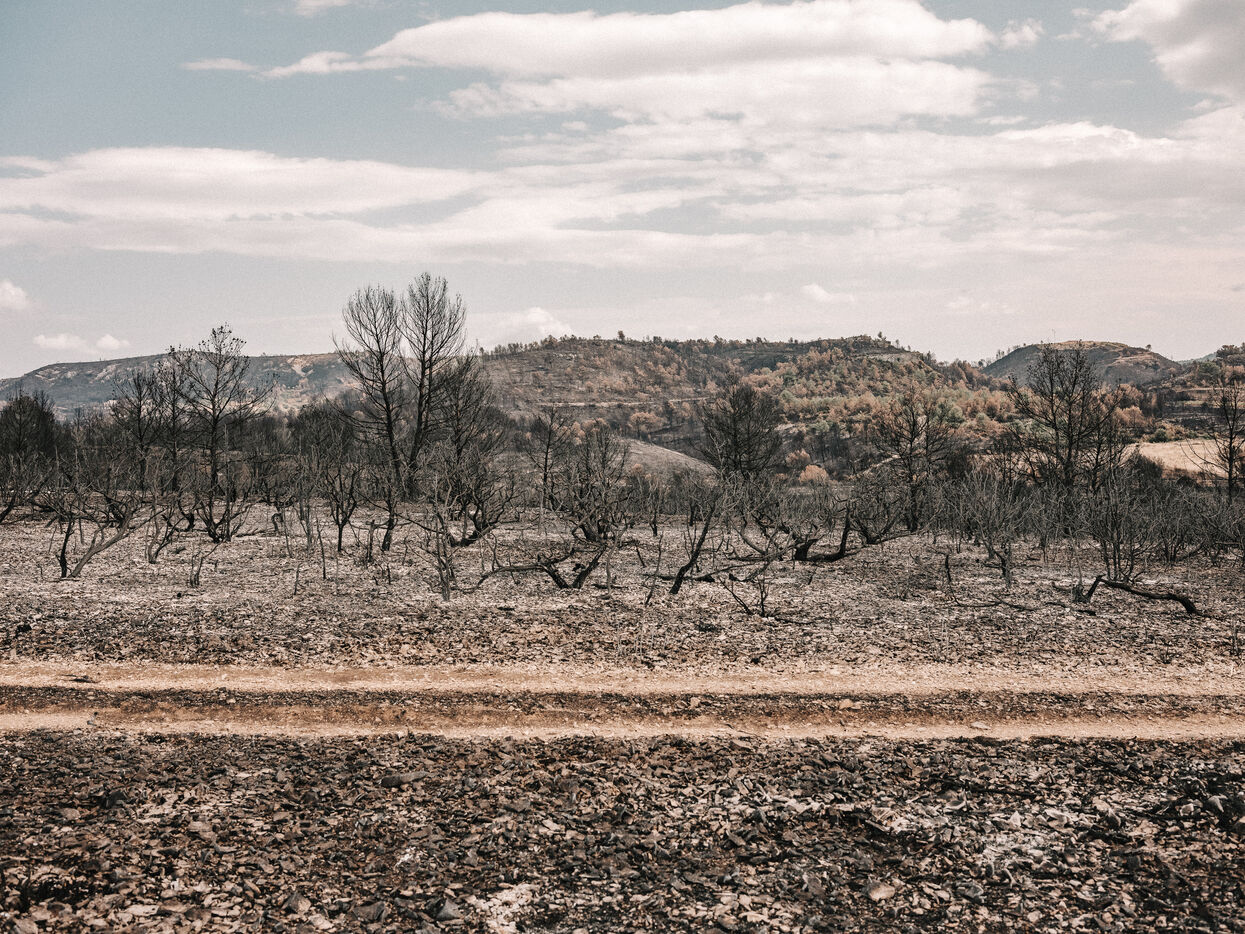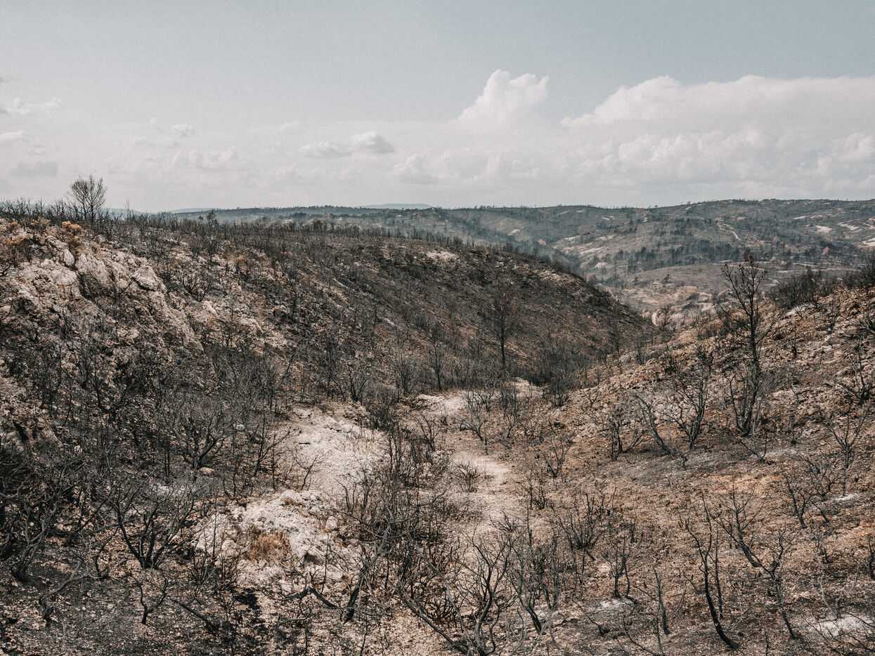Paysages du Massif des Corbières après l'incendie d'août 2025. 17 000 hectares ont été brulés en quelques jours ce qui fait de cet incendie le plus important en France depuis 80 ans.