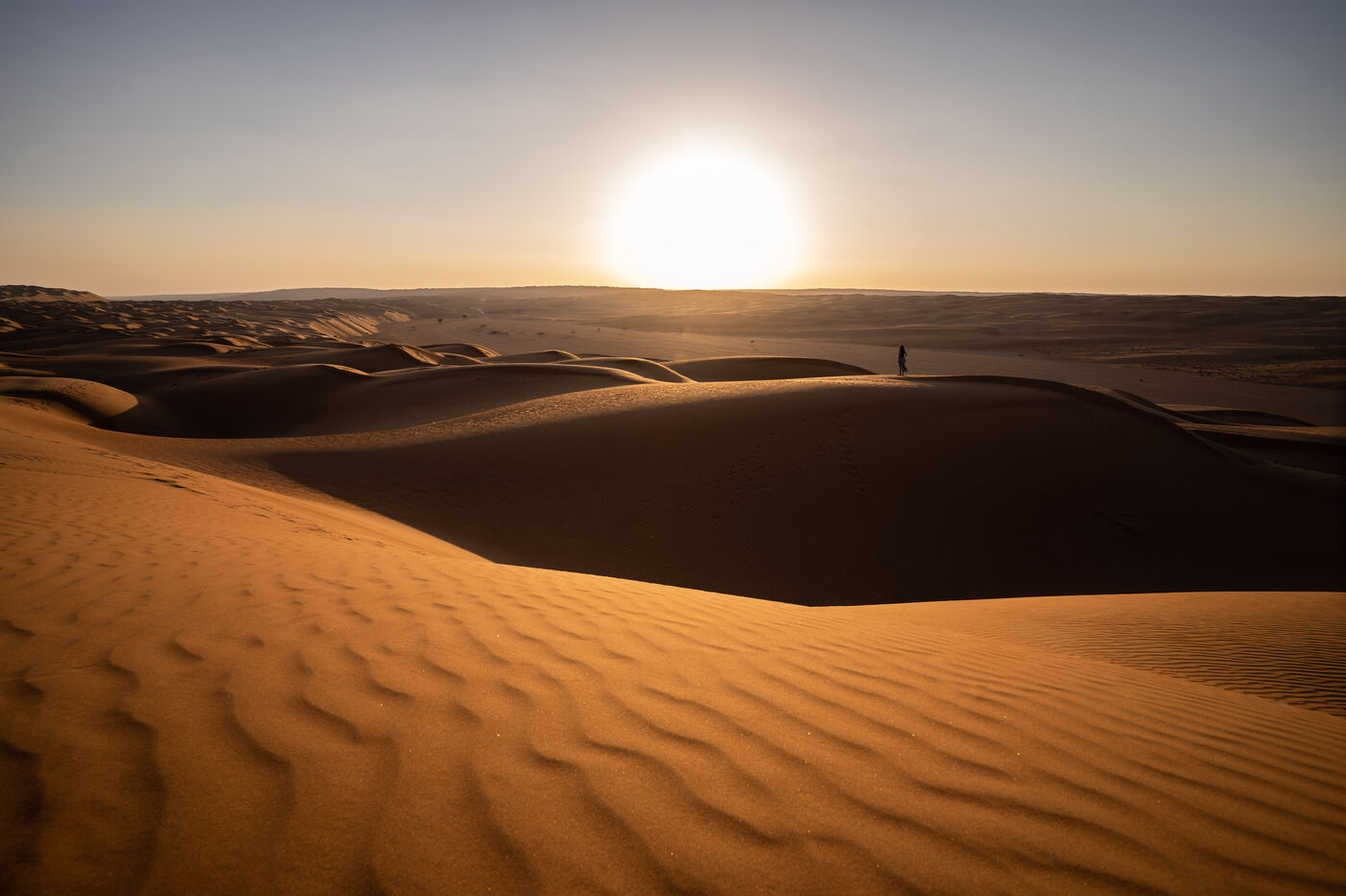 In the heart of the Rub al-Khali desert, also known as the 'Empty Quarter', the sand dunes stretch as far as the eye can see, creating a panorama that is both striking and timeless. Each shot captures the silent immensity of this mythical desert, where the wind carves ephemeral shapes in the sand and silence seems to envelop every speck of dust.