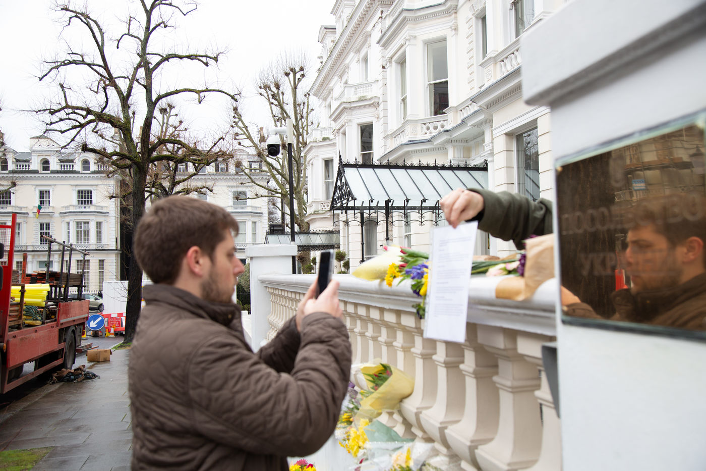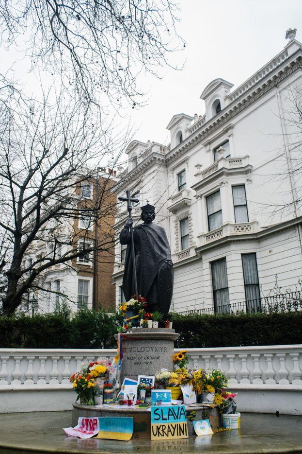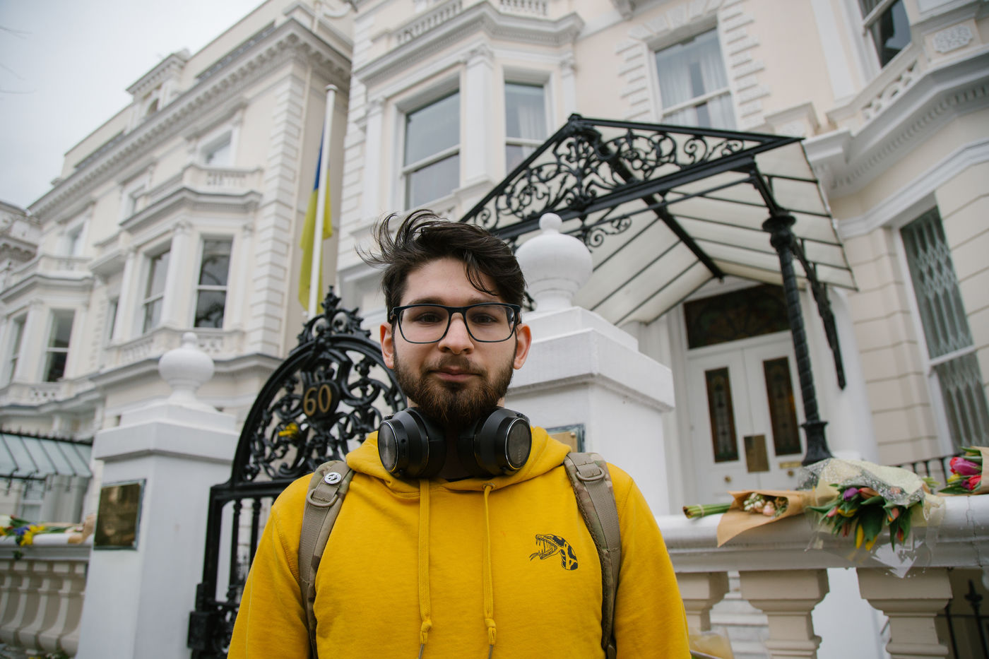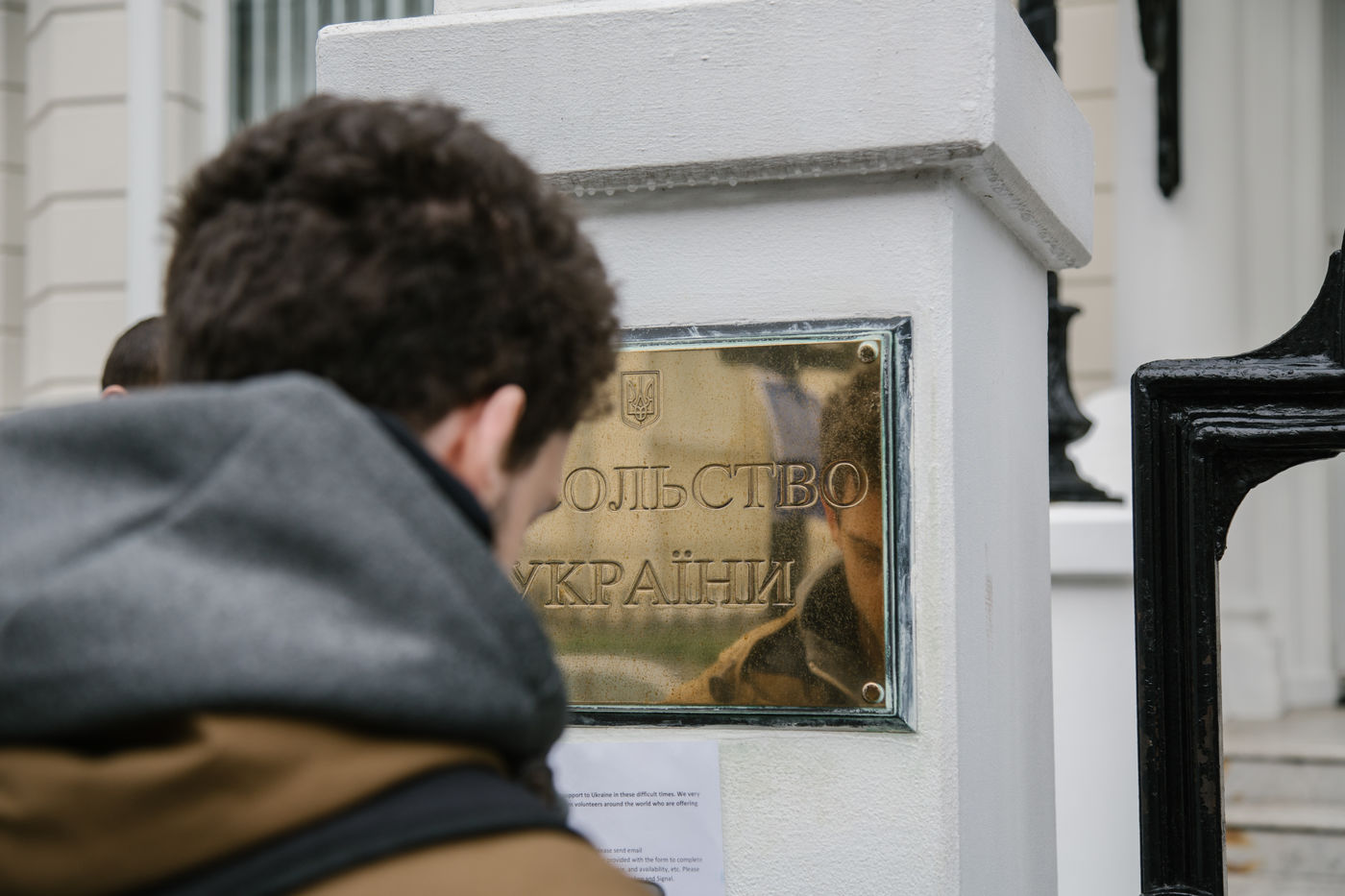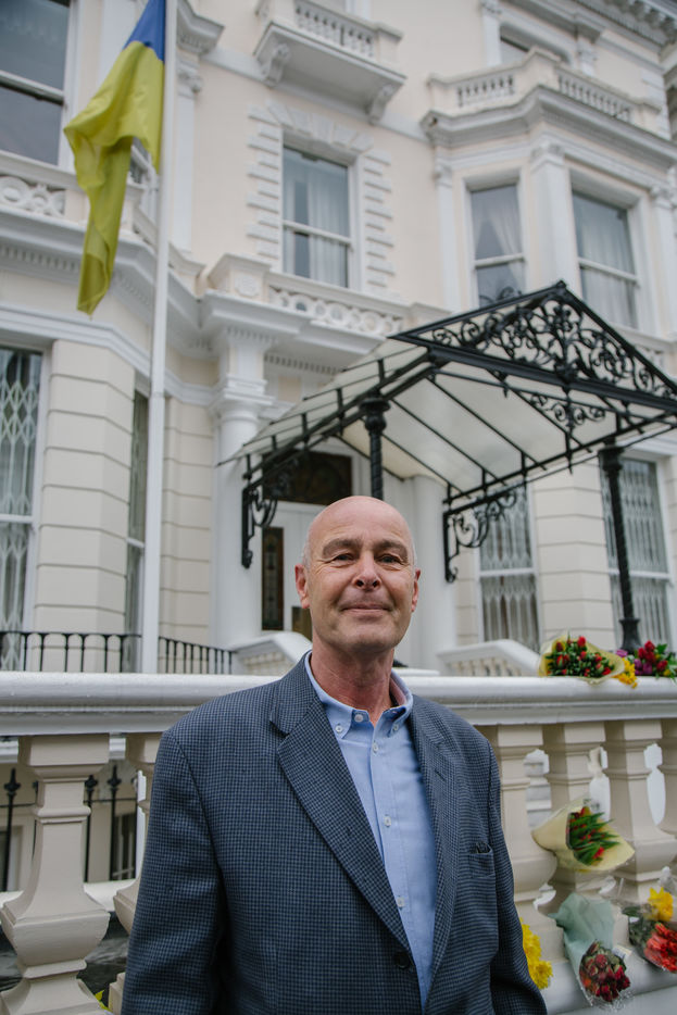Le 2 mars 2022, une poignée de volontaires sonnent l'interphone de l'ambassade d'Ukraine à Londres pour rejoindre la légion internationale pour la Défense de l'Ukraine, annoncé par le président ukrainien le 1er mars. Des hommes âgés de 20 à 63 ans se présente tour à tour devant le bâtiment officiel pour rejoindre les lignes ukrainiennes.