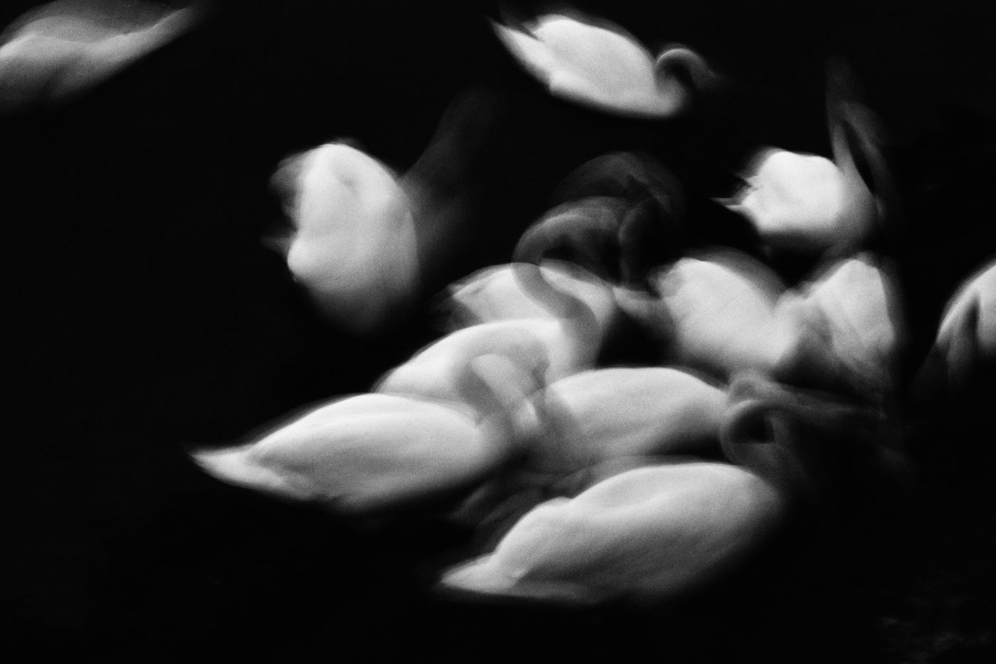 Que dire de ces plans qui glissent, ces contours qui vibrent, ces corps comme taillés dans la brume, ces équilibres qu'un rien peut rompre, qui se rompent et se reforment à mesure qu'on regarde ?
