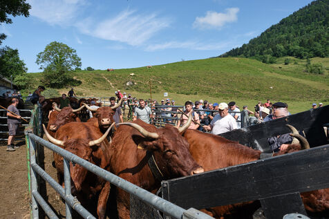 Bénou Plateau, July 4, 2025 - The traditional marking of the herds took place this Friday morning, signaling the start of the summer transhumance in the Ossau Valley. Farmers gathered several hundred cows and horses to mark them with tar using an H (for Haut-Ossau) and a B (for Bilhères and Bielle), ensuring their identification throughout the grazing season in the mountains.