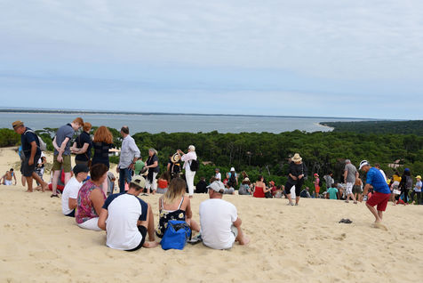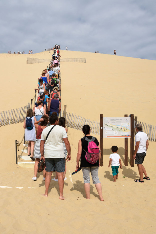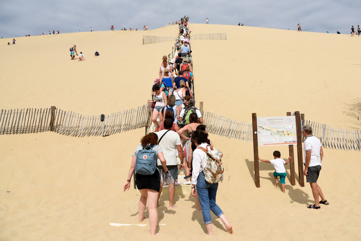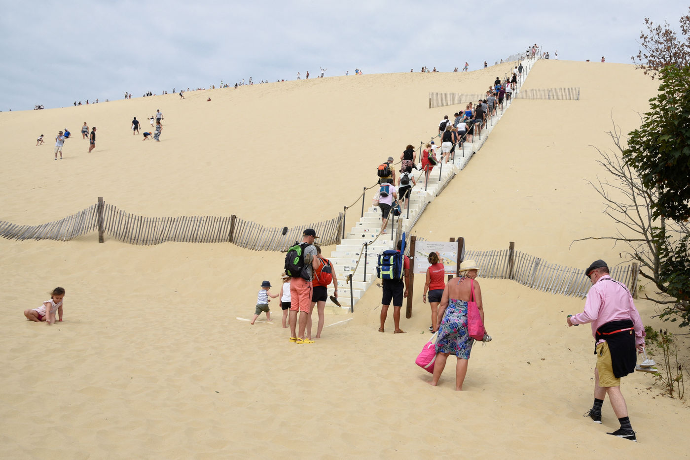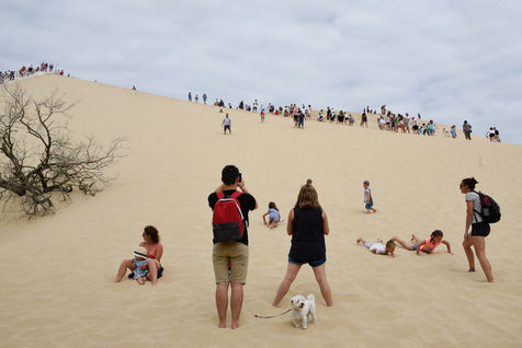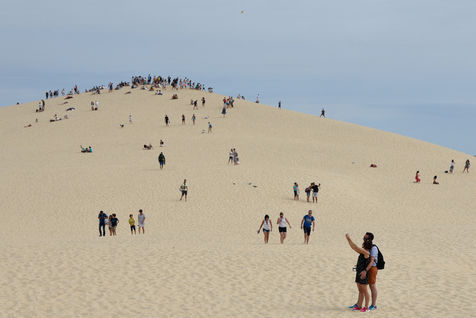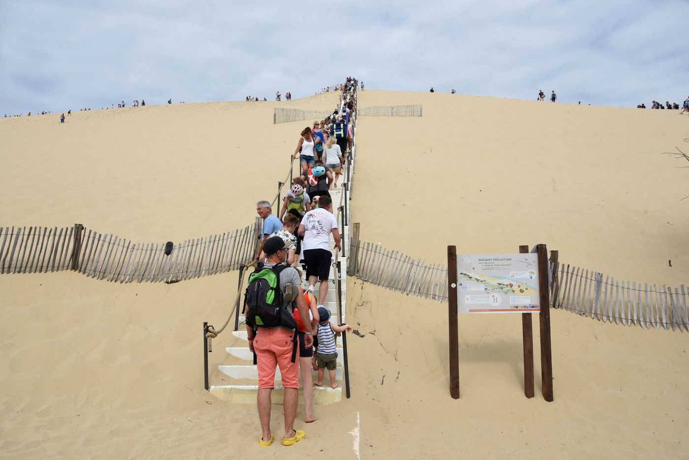Des premières heures du jour dans la quiétude jusqu'à la fin de matinée avec l'arrivée de centaines de touristes, promeneurs, curieux... Avec près de deux millions de visiteurs par an, le site de la Dune du Pilat sur la commune de la Teste de Buch, reste particulièrement prisé avec ses 106,6 m de haut, 3 km de long, des millions de m3 de sable fin et 4000 ans d?histoire sous l?action des vents et des marées. Un patrimoine naturel unique en Europe.