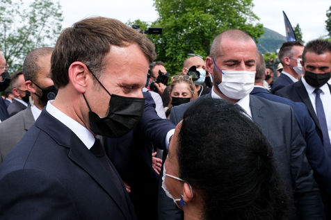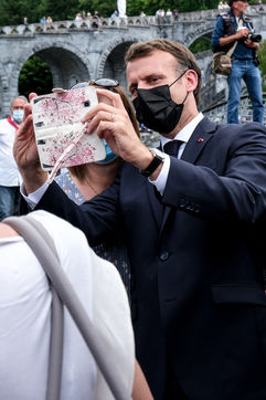 July 16, 2021 - Lourdes - Emmanuel Macron - In the heart of the sanctuary, Emmanuel Macron indulged in a dense crowd of people among the many people who were waiting for him, including hospital workers and pilgrims with the traditional selfies, kind words, presentation of a rosary ... The president of the French republic came this Friday, July 16, 2021 to the sanctuary of Lourdes, as an extension of a day spent in the Hautes-Pyrenees between a stage of the Tour de France and the visit of a factory. Emmanuel Macron was welcomed by Mgr Herouard, apostolic delegate of the sanctuary, and Mgr Olivier Ribadeau Dumas, the rector. This is the first visit by a president of the 5th Republic to the largest Catholic Sanctuary in France.