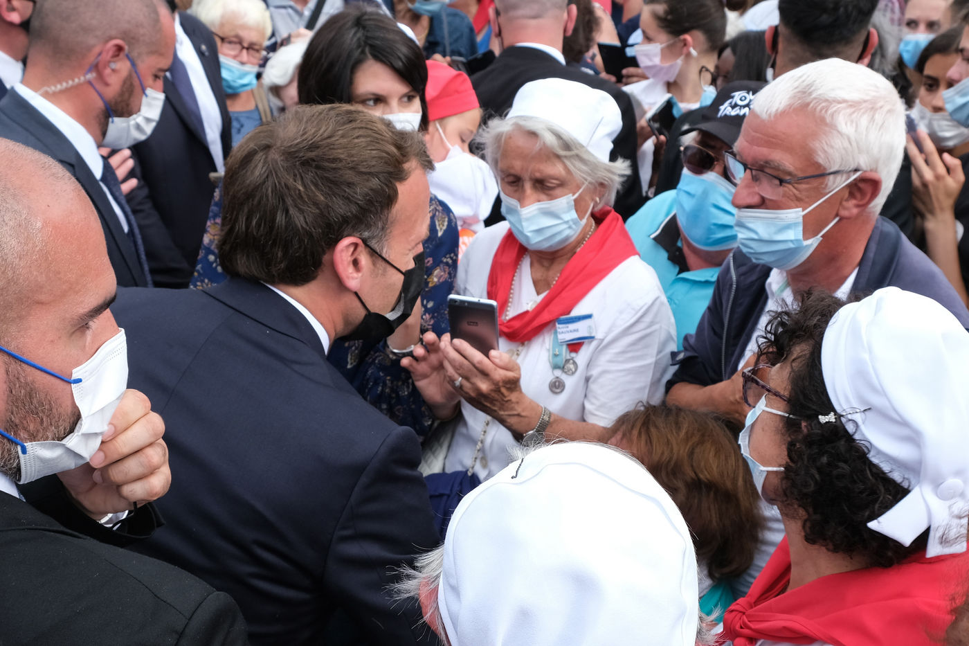 Au coeur du sanctuaire, Emmanuel Macron s'est livre a un bain de foule dense parmi les personnes qui l'attendaient nombreuses dont les hospitaliers et pelerins avec les traditionnels selfies, paroles bienveillantes, remise d'un chapelet... Le president de la republique francaise est venu ce vendredi 16 juillet 2021 au sanctuaire de Lourdes, dans le prolongement d'une journee passee dans les Hautes-Pyrenees entre une etape du Tour de France et la visite d'une usine. Emmanuel Macron a ete accueilli par Mgr Herouard, delegue apostolique du sanctuaire, et Mgr Olivier Ribadeau Dumas, le recteur. Il s'agit de la premiere visite d'un president de la 5eme Republique dans le plus grand Sanctuaire catholique de France.