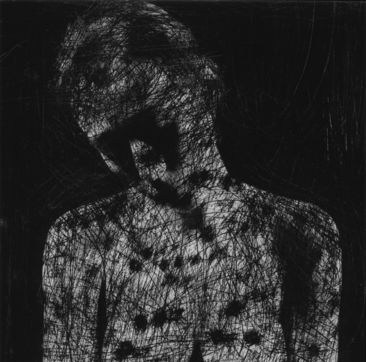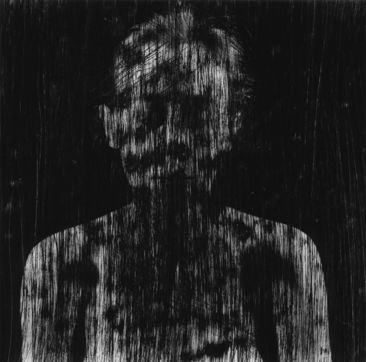 Ainsi, la pièce La mort dans l'âme (2000) repose sur une manipulation non plus optique (Peau de chagrin, Chambre close...), mais physique d'un film issu d'une séance de portrait ancienne. C'est la surface/matière même du support photographique (le négatif) qui est attaquée ici, avec une violence ravie, par la main et le papier de verre. Il a fallu à ce moment là que cette main griffe avec une sorte de hargne la respectable pellicule. Ah, la spontanéité et l'inexplicable du geste ! Le grain de sable. Contre le processus de la machine photographique dont on sait qu'il est asservi, conçu pour produire efficacement des images lisses, ressemblantes. Contre la mollesse qui nous guette, nous gagne. Contre et pour l'image photographique, ce si peu de matière qui sait si bien nous leurrer. Pour une mise au point réglée maintenant au plus près, sur la cicatrice inscrite. A même la peau, à même la photographie, stigmatisée, désignée.