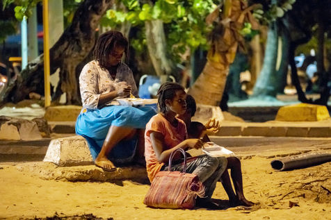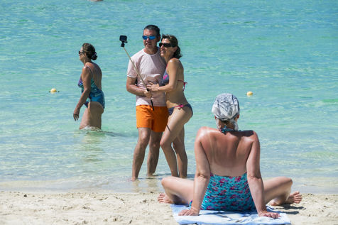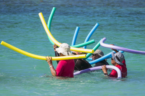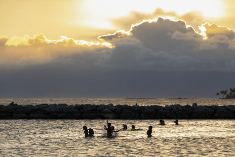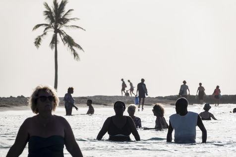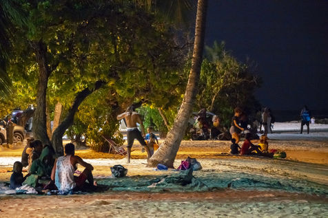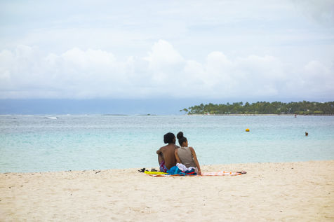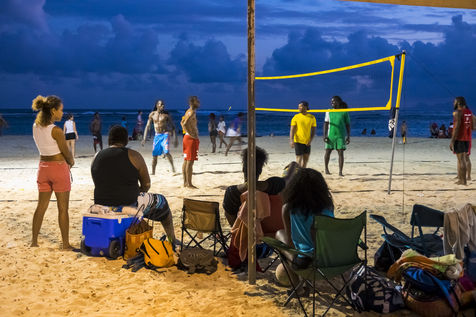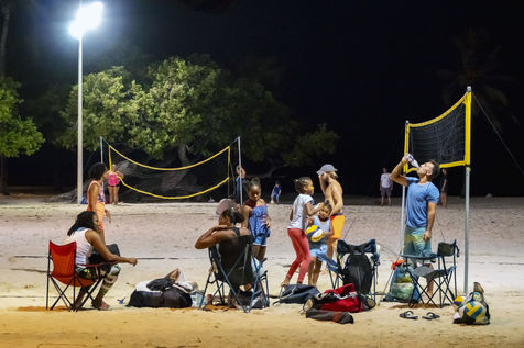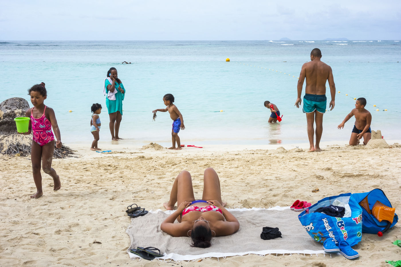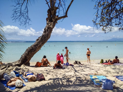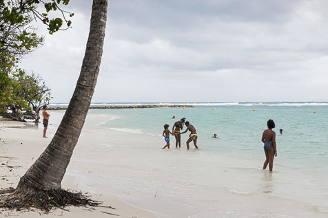 Peu à peu, l'occupation « dynamique » de la plage cède la place aux estivants qui viennent s'aplatir sur leur serviette pour le bain de soleil attendu. Une population familiale, plutôt âgée, des habitués aussi. Crème solaire, lectures, baignade... Seuls quelques nageurs expérimentés crawlent méthodiquement au large. Aux Antilles, la mer est un espace social, on y fait trempette longtemps et toujours en groupe.
