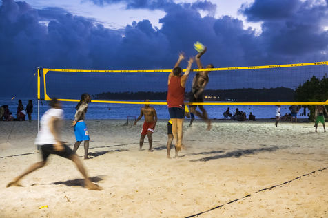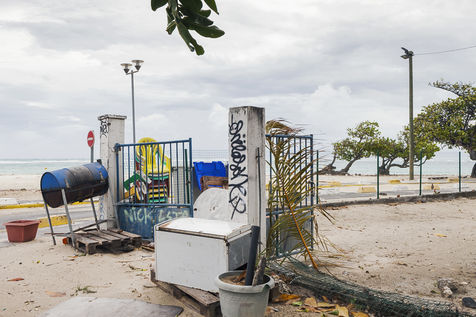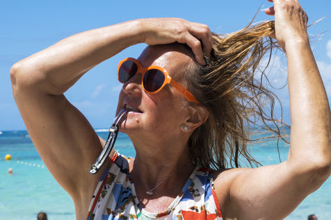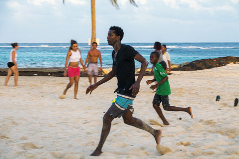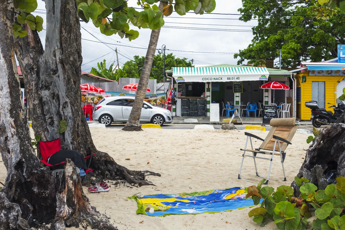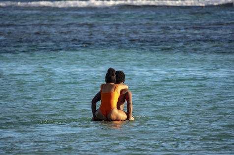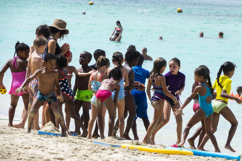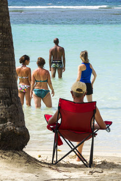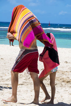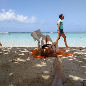 Little by little, the "dynamic" occupation of the beach gives way to the summer people who come to flatten themselves on their towels for the expected sunbathing. A family population, rather old, regulars too. Sunscreen, reading, bathing... Only a few experienced swimmers methodically crawl offshore. In the West Indies, the sea is a social space, we soak for a long time and always in groups.