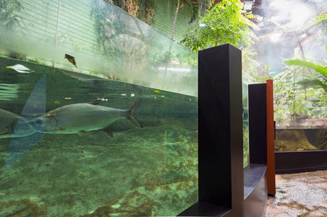 Je me retrouve au chaud devant les aquariums du bassin tropical, heureux au fond comme perché au-dessus de l'étrave de la barque qui sinue dans la mangrove ! Mais un décor un peu froid, figé sans l'odeur puissante des eaux qui se décomposent en une diversité de liqueurs aromatiques, là-bas ! J'assiste, médusé, à l'incessant ballet des poissons projeté sur le mauvais écran de verre des bassins qui diffracte la lumière, flares et artefacts. Je m'épuise à suivre les aller-retours de nos amis aquatiques. Un mérou coquet s'attarde un peu...