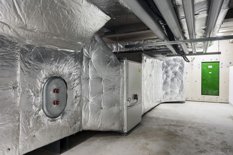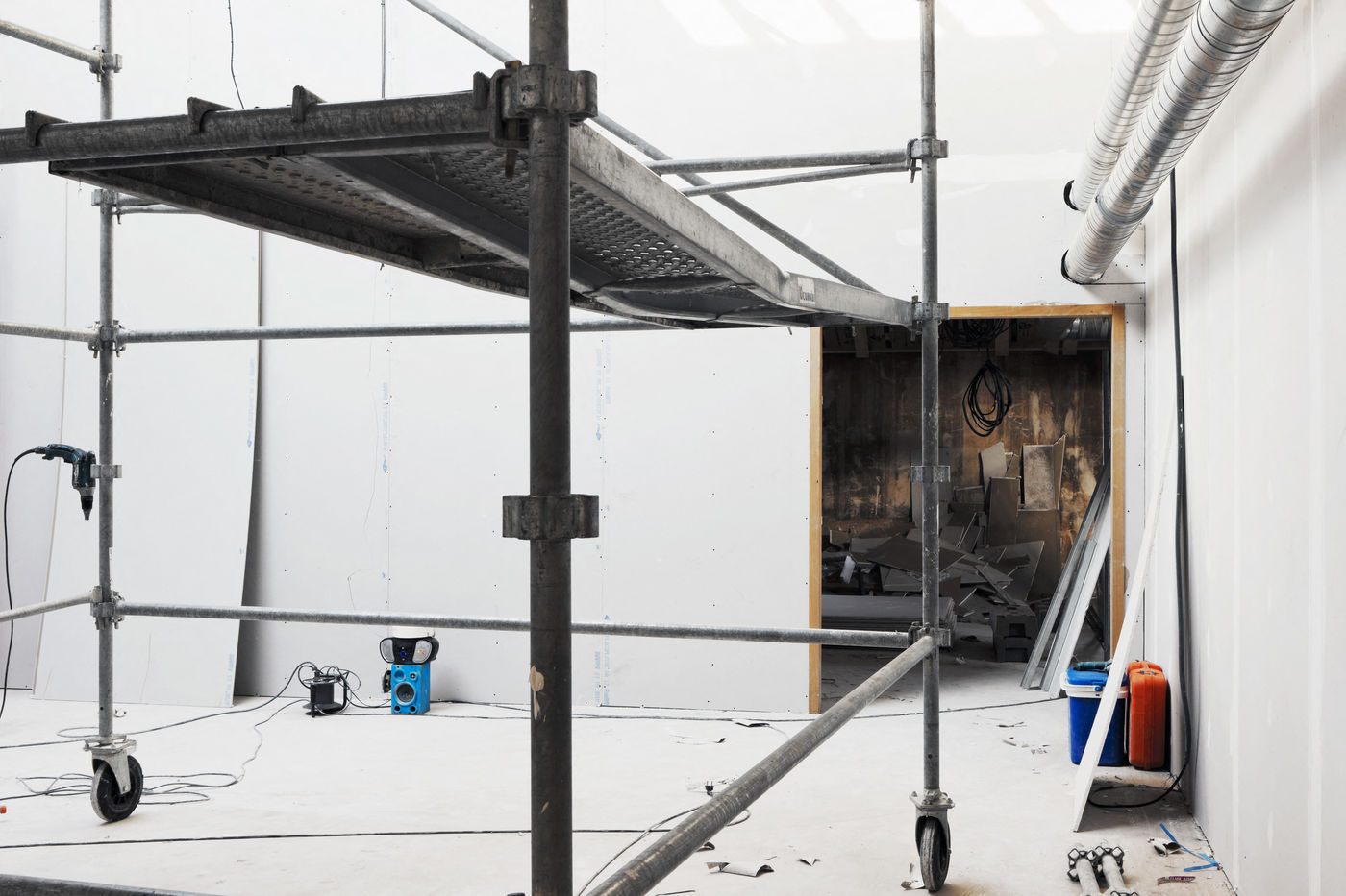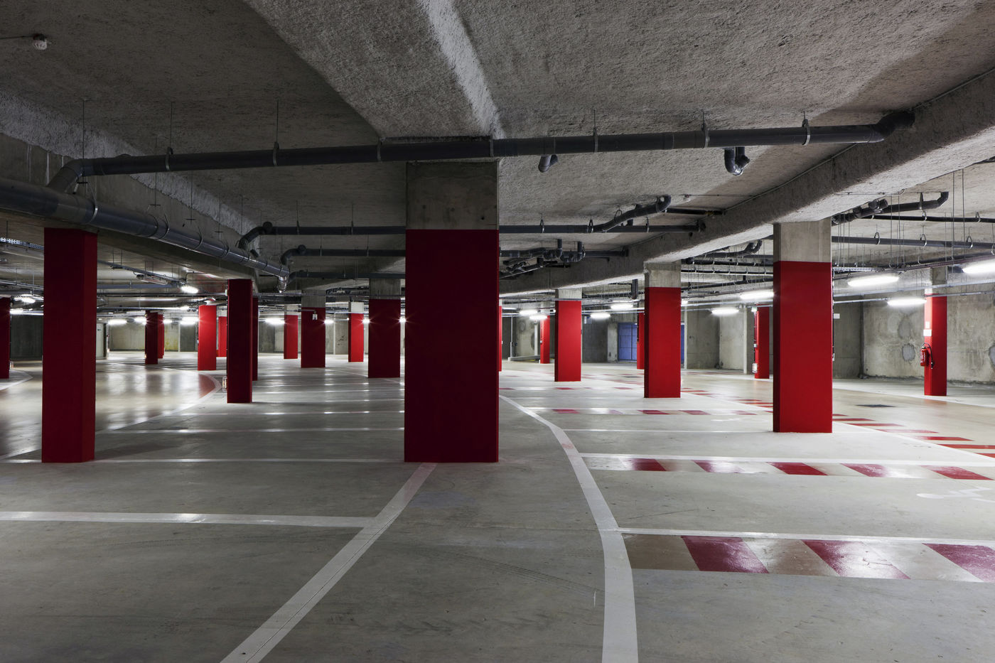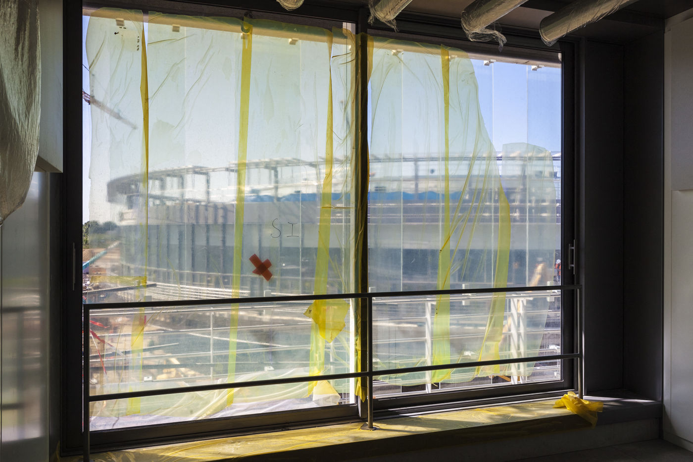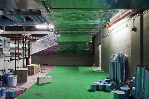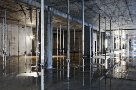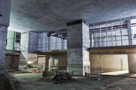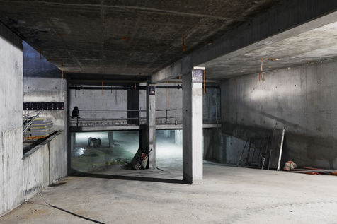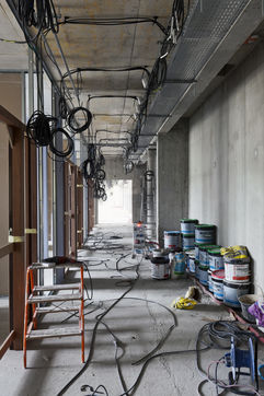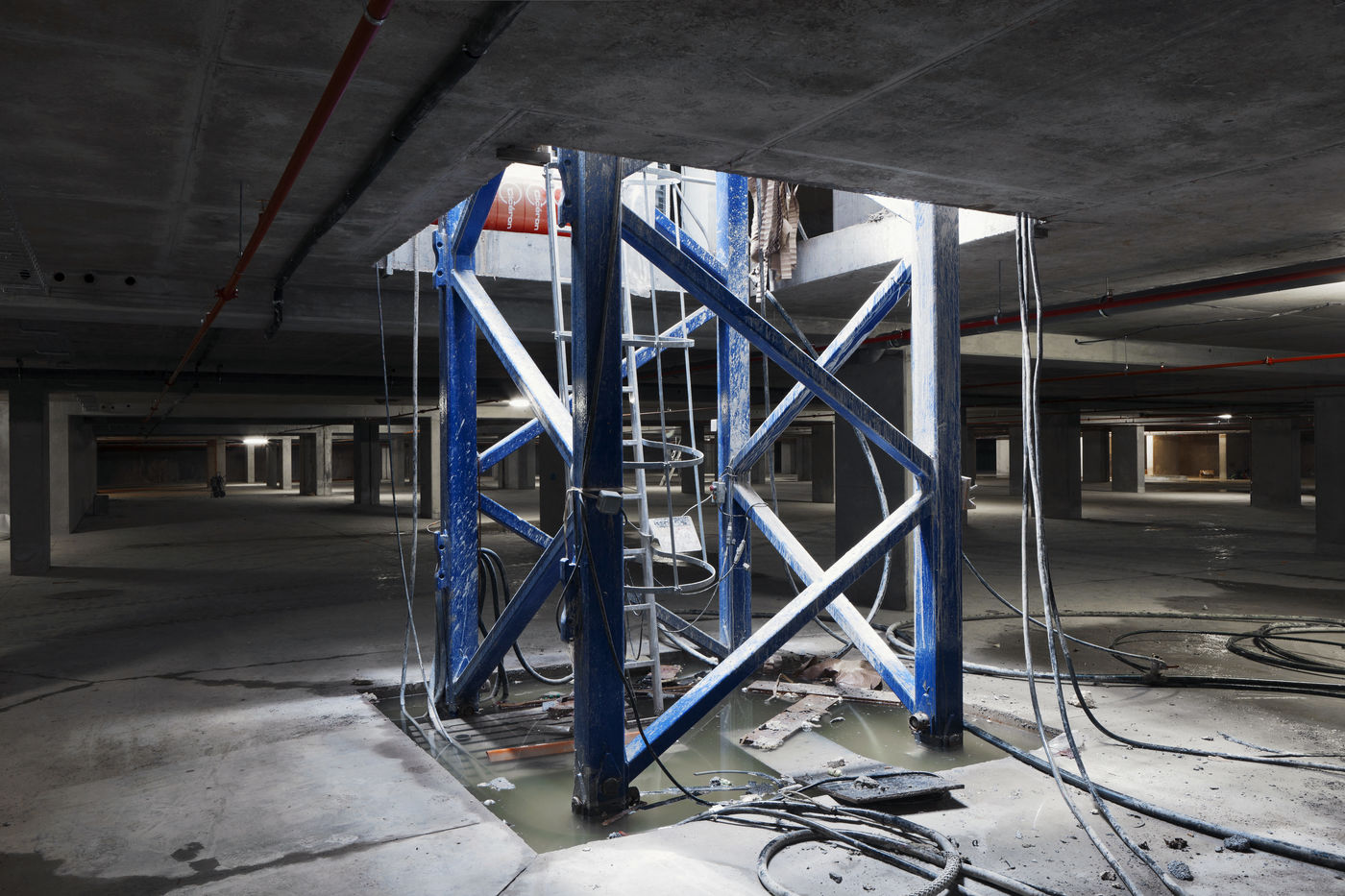 It is within the framework of a long-term photographic campaign for the SNEF Group, an international company based in Marseille and specialized in electrical and climatic engineering, that I survey these buildings under construction that we call building sites. But not at any time. At this moment when, exposed, flayed, the space is waiting for a completion. Guts in the air. It is necessary to nourish it, to irrigate it, to feed it for its intended use before the veneer and the interior decoration conceal the organic nature of this work.