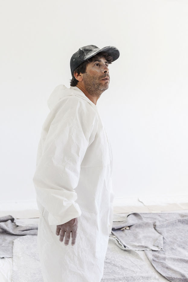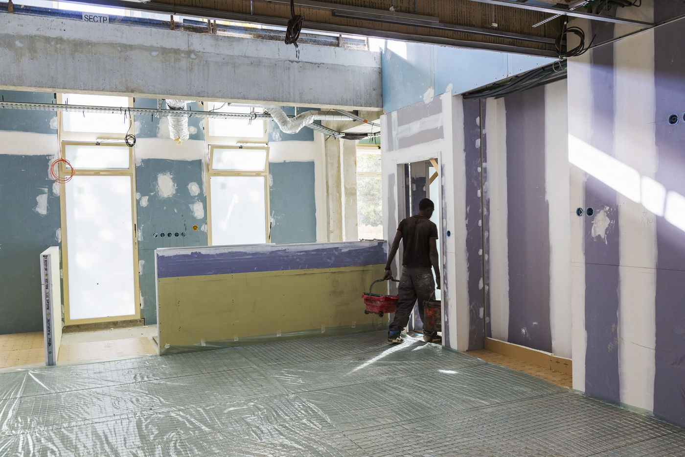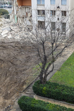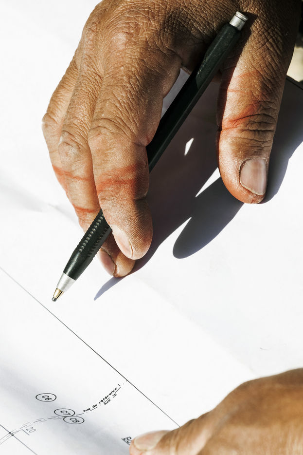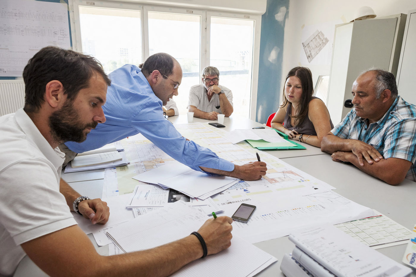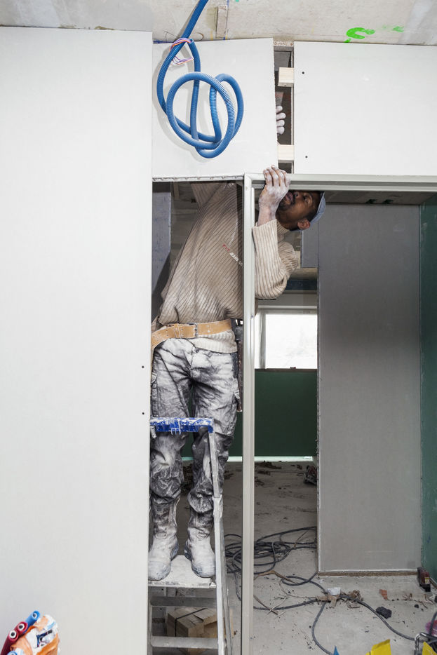 Depuis fin 2013 - les immeubles existants et leur démolition - jusqu'au début 2016, date de la réception de la résidence, je suis allé faire des images de cette étrange chorégraphie. Les premiers temps, pendant le gros oeuvre, le chantier à ciel ouvert déploie une cartographie lisible, mais la fourmilière se complique ensuite lorsque tous les corps d'état travaillent de façon disséminée dans l'édifice. Lorsque l'espace s'y prête, les performances optiques de nos appareils nous autorisent des prises de vue à distance, à la manière des entomologistes qui observent des insectes dans leurs interactions avec l'homme et qui les épinglent parfois en d'étranges collections de spécimens. Sans contester cette posture qui fut aussi la mienne par moments durant ces deux années passées ensemble, j'ai choisi une autre distance, celle que je nommerais celle de la poignée de mains ! Quitte à trébucher sur les ferraillages, mordre la poussière ou glisser dans les flaques de boue... Être au plus près ! Respect !