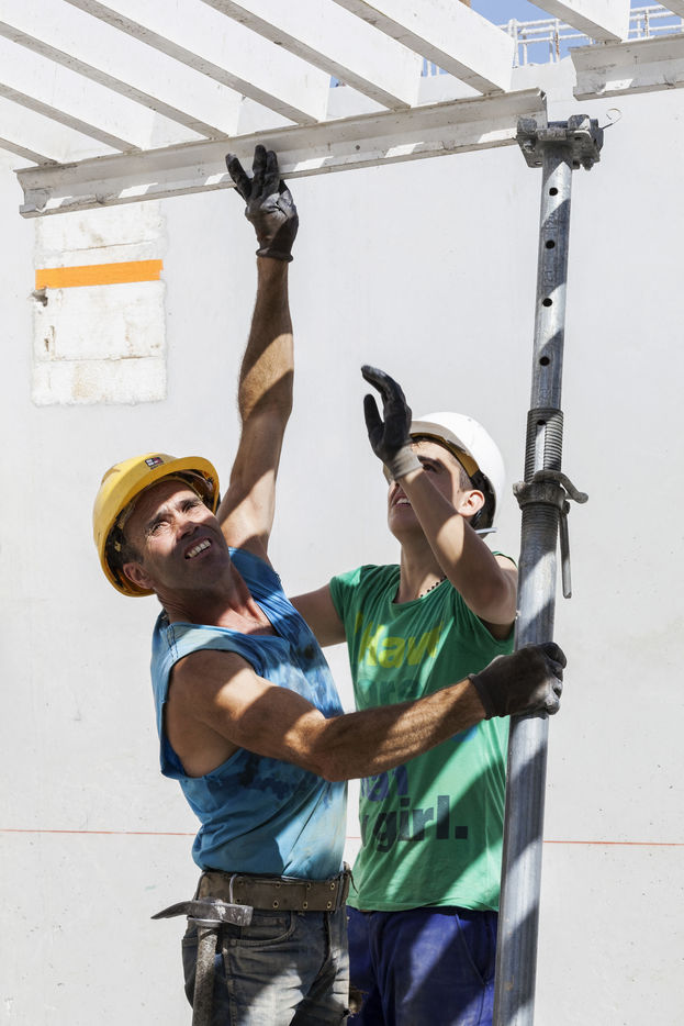 Les images sont silencieuses, tiennent cette vie hors cadre, elles instaurent un moment de repos dans le tintamarre du monde. Eternisent le temps dans une visibilité des corps au travail dont les gestes maîtrisés s'enchaînent tout en se réinventant parce que rien ne se répète jamais à l'identique, ces gestes dont certains semblent aujourd'hui sortir tout droit des temps les plus anciens. Ces acrobates savent si bien « penser avec les mains » ! C'est cet aspect de mon suivi photographique que j'ai choisi de privilégier dans cette sélection d'images, ces acteurs de l'ombre qui ont édifié ces parois et puis ce toit dans une armature innervée qui permettra à d'autres de s'abriter. Hommes à qui je souhaite rendre hommage, ils ont depuis longtemps vidé les lieux pour que d'autres viennent y habiter. Une leçon de modestie, quelle leçon !