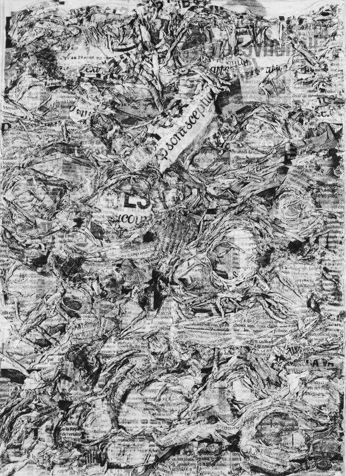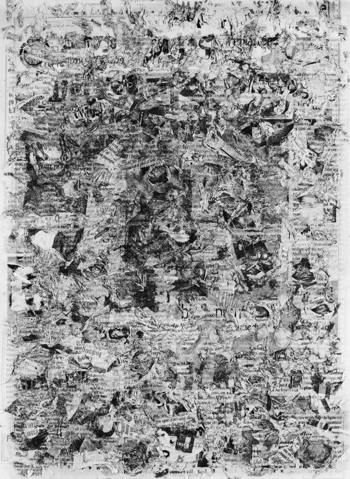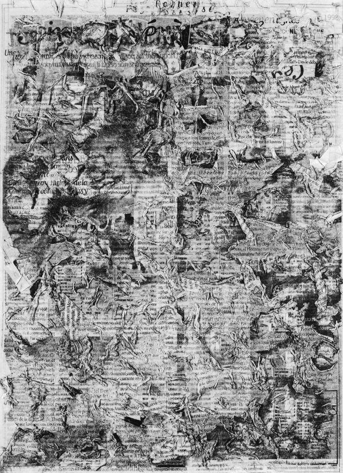 But have we really weighed what happens to what was written in the newspaper, what remains in us (individually, collectively), what is archived there? Lionel Fourneaux, takes this question in hand: soaks the newspaper long enough to almost bring it back to its former state of paper pulp, then re-spreads it with what was written on it and which is now incorporated into it. The writing has become a raw material in the process. You see the result. Why does one start thinking about an etching, an old Dürer, for example? All this random dispersion of what was written, the day before, tied to the material of the support, brings us back to an old and melancholic technique of reproduction? Isn't that what this series indicates: the space of the image, isn't it this reminder of the very old that rises from a magma of memory: finally, isn't that the real intimacy of the everyday?