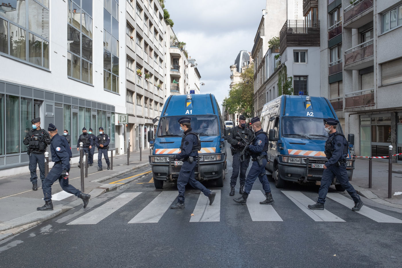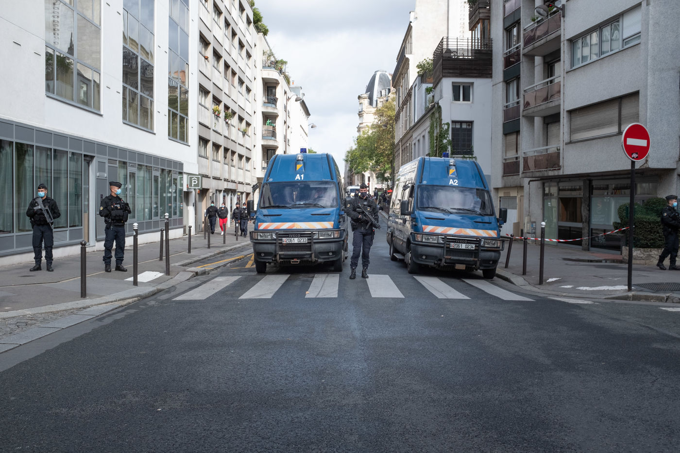 Une attaque à la hachette a eu lieu devant les anciens locaux de Charlie Hebdo. La Police bloque tout le perimetre autour de la rue Nicolas Appert et du bd Richard Lenoir. On déplore 2 blessés grave - Paris 11eme - 25 septembre 2020.
