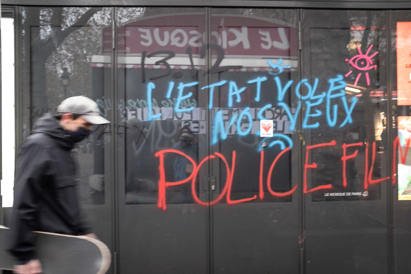 Au lendemain de La marche des Libertes, les tensions se lisent sur les murs de la ville , les traces de la colere défilent le long des trottoirs. Entre la place de la Republique et la place de la Bastille, les manifestant ont défilé pour denoncer les violences policieres et la proposition de loi "securite globale". Paris, 28 et 29 novembre 2020.
