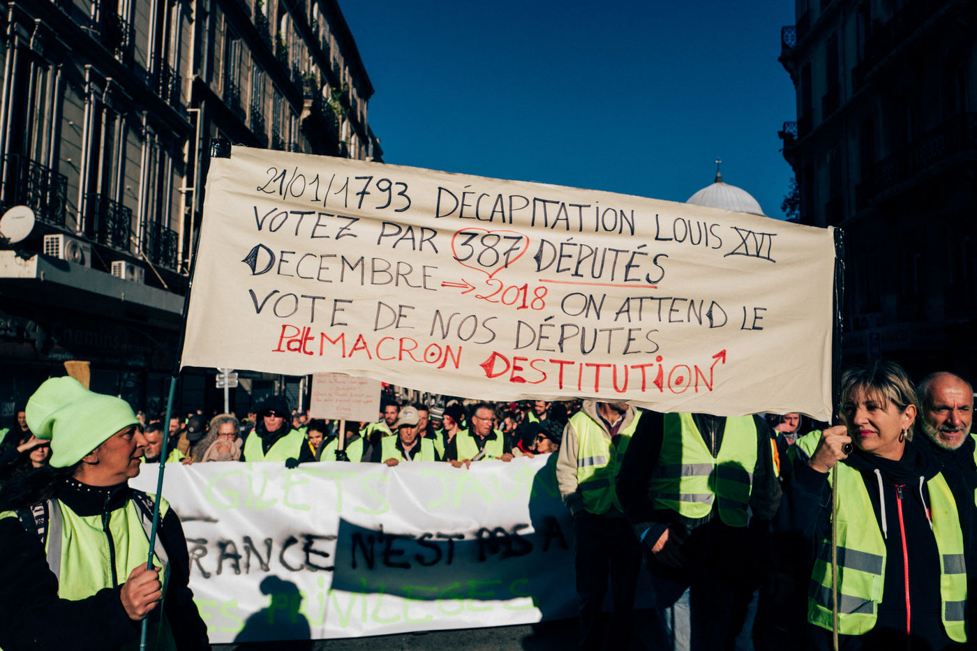 loi Pompidou-Giscard-Rothschild »), démission pure et simple d'Emmanuel Macron, VIème République, fin de certains privilèges, que les gendarmes retirent leurs casques (qu'ils ne portaient pas à l'arrivée du cortège). La foule est calme mais les messages forts et les appels au calme et à la non-violence multiples.