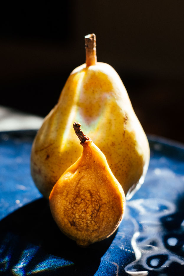 The silhouette of the pear is still there, but the fruit is flattened. Pressed rather than beaten, the tapped pear has a slightly denser texture than a fruit paste and a concentrated taste. It can be eaten as is or rehydrated in wine, broth or other liquid.