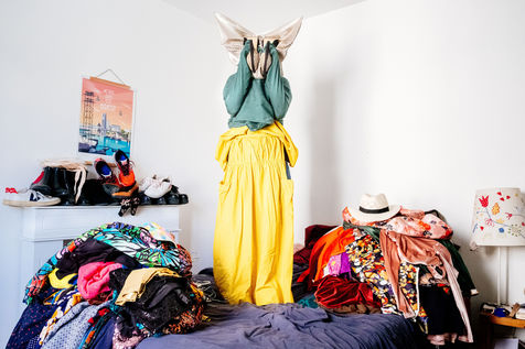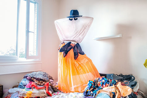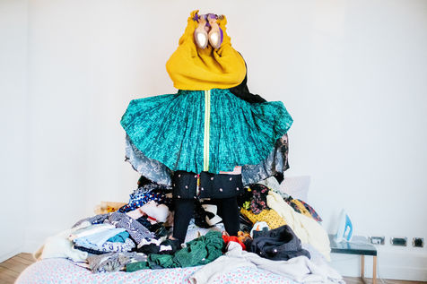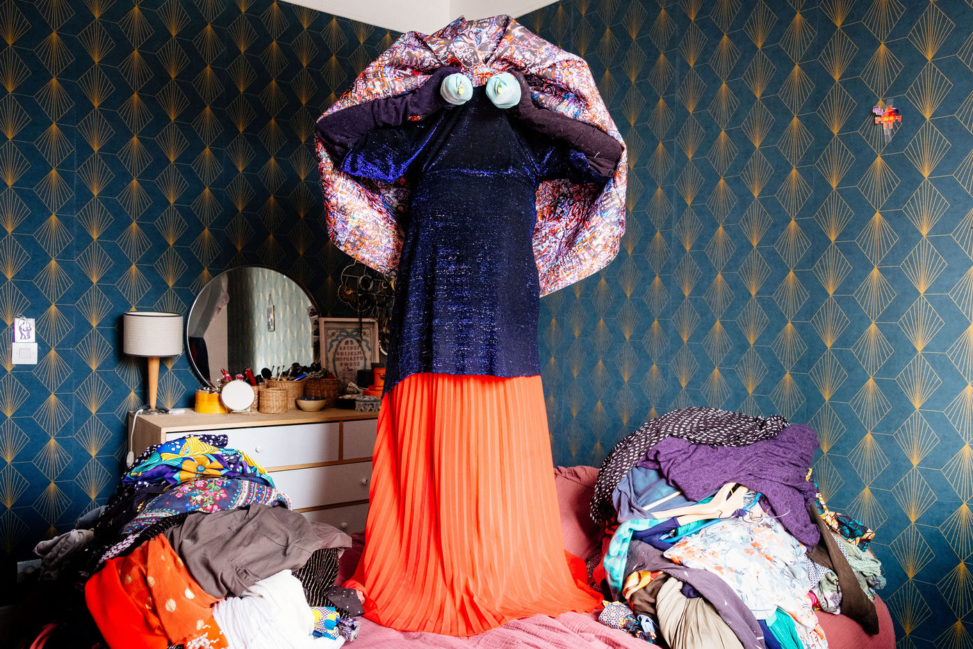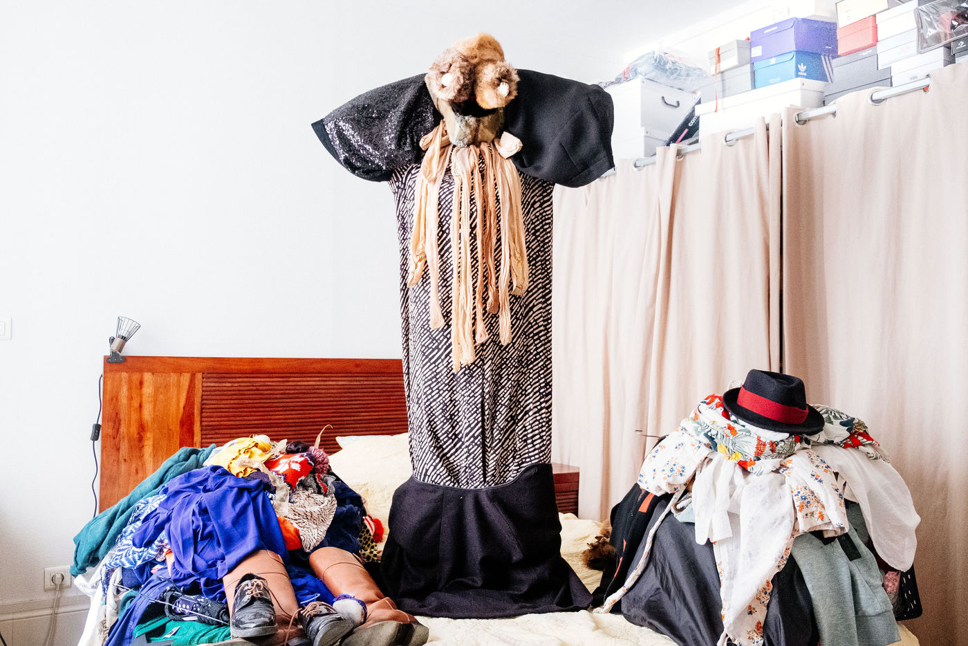 Fashion Monsters is a project that aims to question us all on our (over?)consumption of clothes. For each image, the process is simple: I go to the home of the person whose portrait I am making, we unpack all their clothes from their wardrobe, choosing some, and putting the rest on the bed. Then the subject is placed in the centre of the frame, and I transform him into a "monster" of clothes, with his active participation, covering him with successive layers of clothes, diverting their original purpose to make worrying eyes, a beastly mouth, endless claws.