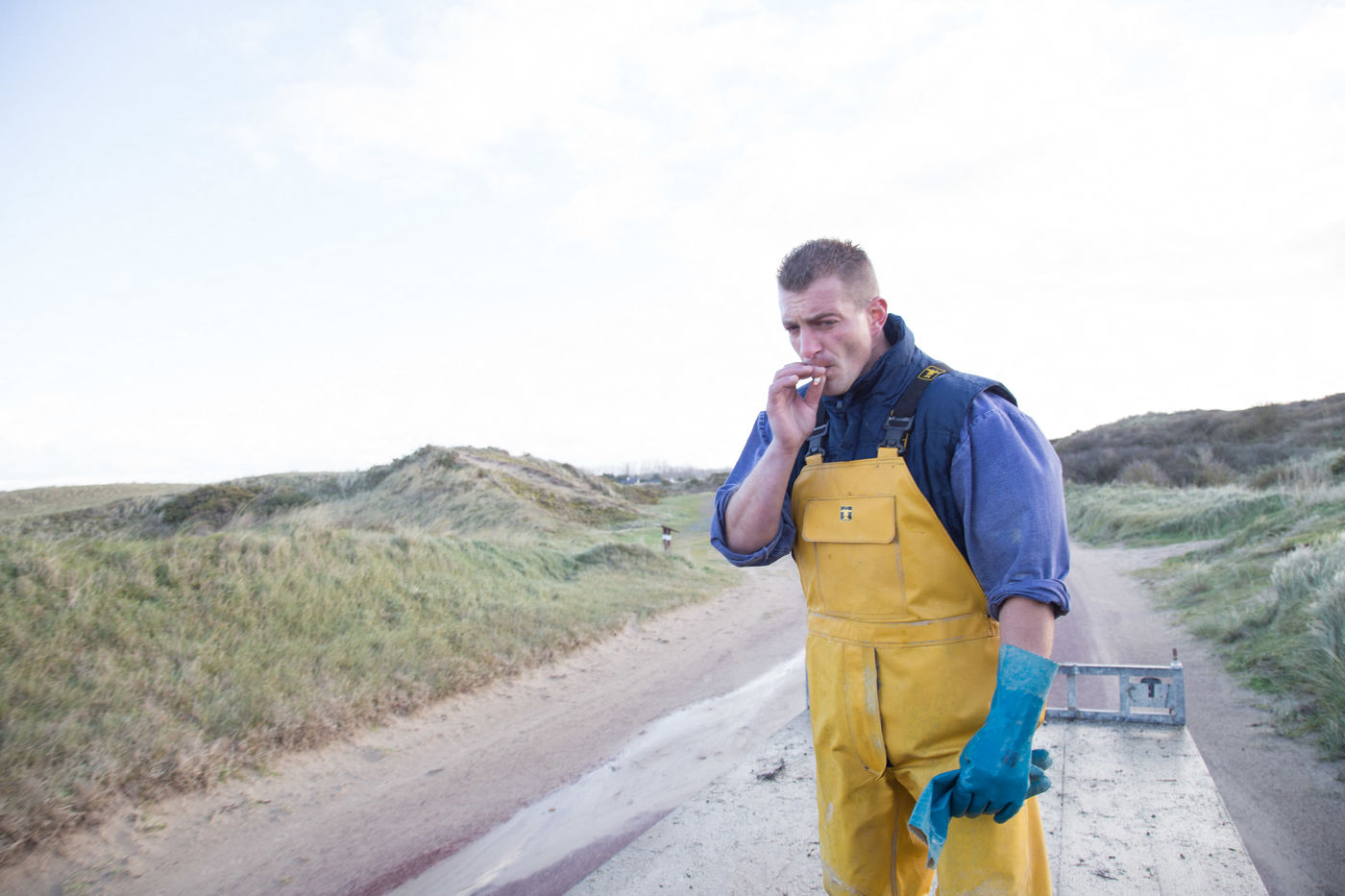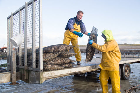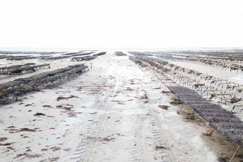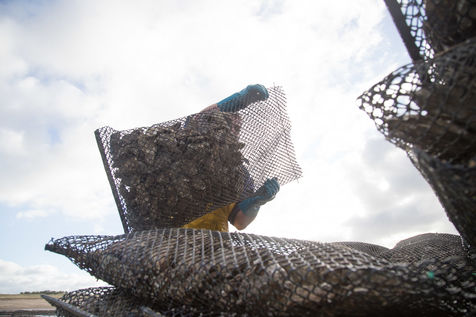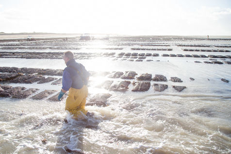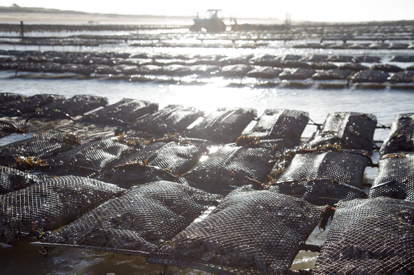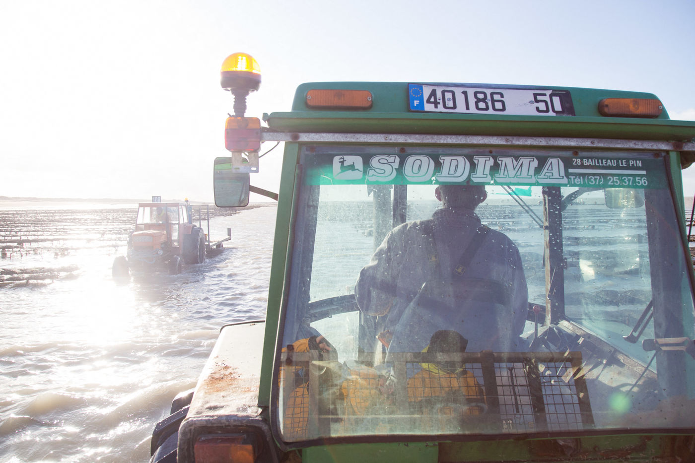 J'embarque alors sur la remorque du tracteur avec 3 employés et quelques minutes plus tard, nous nous retrouvons sur la plage, les cuissardes dans l'eau. Le soleil était présent, ce n'est pas comme la veille où les gars ont dû se rendre à la marée au même moment qu'une averse de grêle. Le vent reste frais, ils décrochent les poches, les mettent sur la remorque et rentrent à l'atelier de production.
