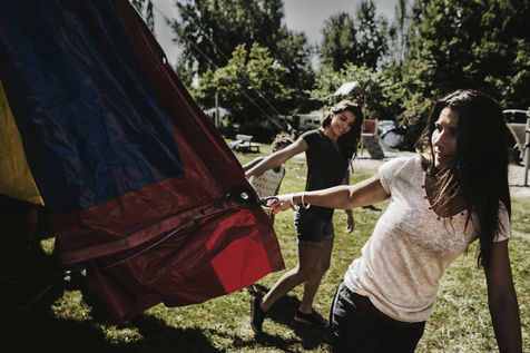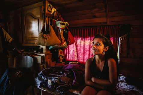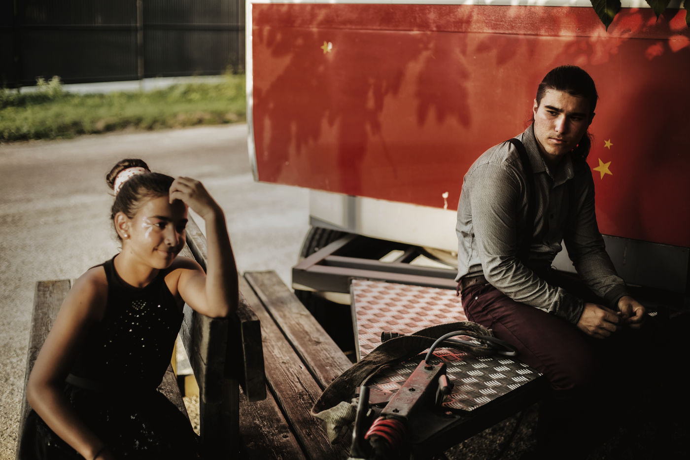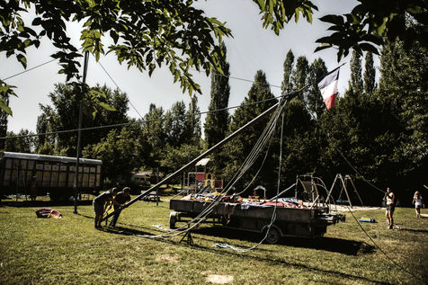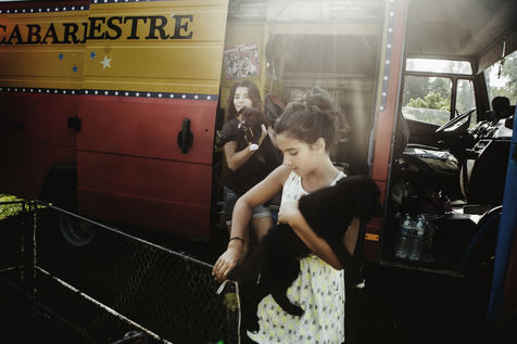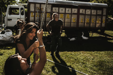 The Lauroras were leading an ordinary "gadjos" life in Paris when Jean-Marc, a leading stuntman at Disneyland, suggested to his wife that they start their own circus company with a pocket tent and three trailers chased on the corner. While the couple alternate equestrian acrobatics and burlesque performances, Aleandro, 8, appears from time to time on the track to play the clown while his younger sister Enola improves her hula-hoop behind the scenes. "Giovan and Nina joined us a little later. Nina was still in her crib when we started the circus," Nadège recalls.