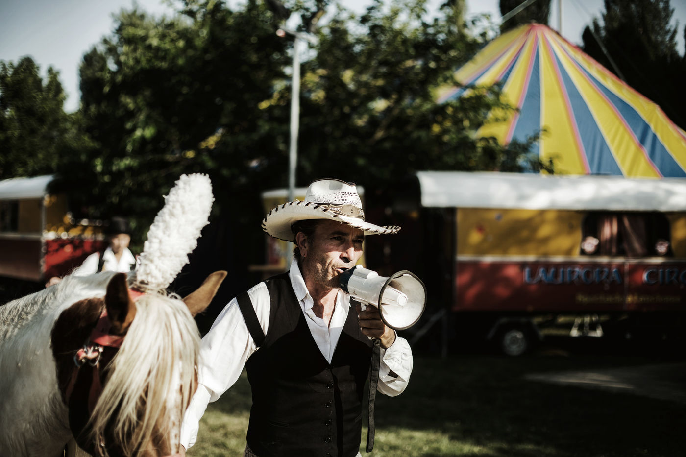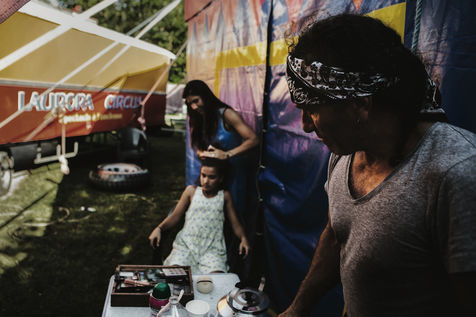 Les Laurora menaient une vie ordinaire de « gadjos » à Paris quand Jean-Marc, cascadeur de premier plan à Disneyland, a suggéré à sa femme de monter leur propre compagnie de cirque avec un chapiteau de poche et trois roulottes chinées sur leboncoin. Tandis que le couple alterne numéros de voltige équestre et performances burlesques, Aleandro, 8 ans, apparaît de temps à autre sur la piste pour faire le clown tandis que sa jeune soeur Enola se perfectionne au hula-hoop en coulisses. « Giovan et Nina nous ont rejoints un peu plus tard. Nina était encore dans son berceau quand on a lancé le cirque », se souvient Nadège.