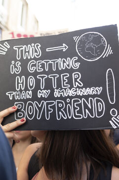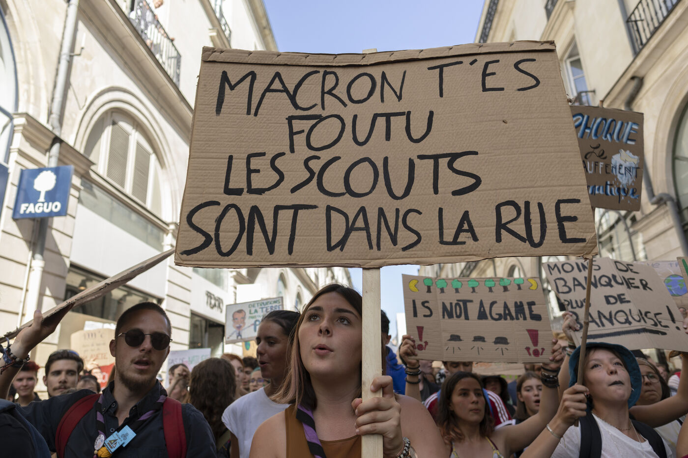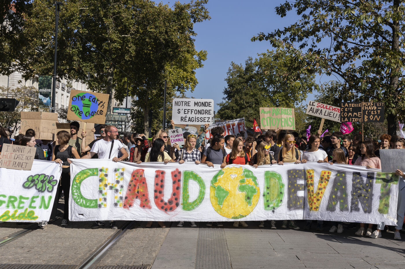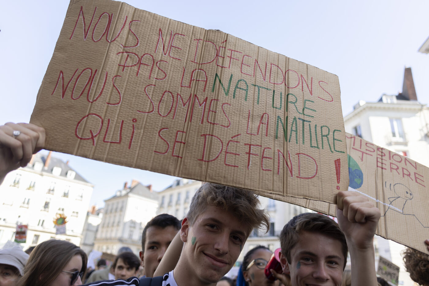 Global strike for climate, youth hold placards and banners against climate change during a global protest in Nantes on September 20, 2019.