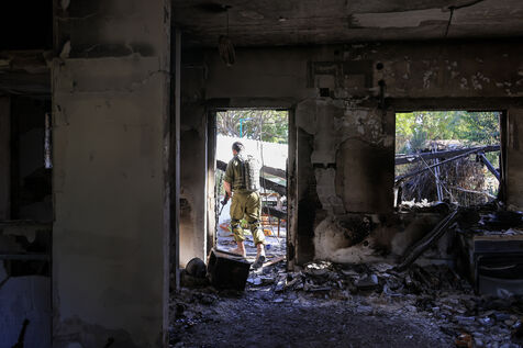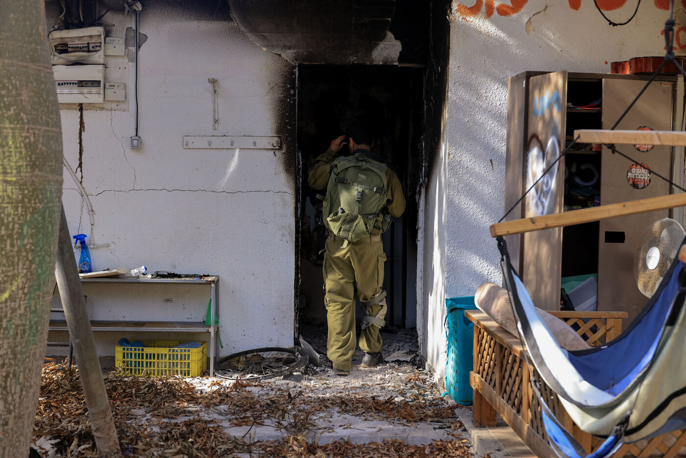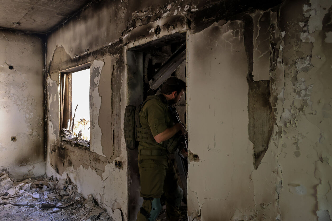 A soldier is seen inside a damaged house in the kibbutz Nir Oz, near the Gaza Strip, attacked on October 7 by the Palestinian militant group Hamas, on October 30, 2023.