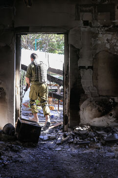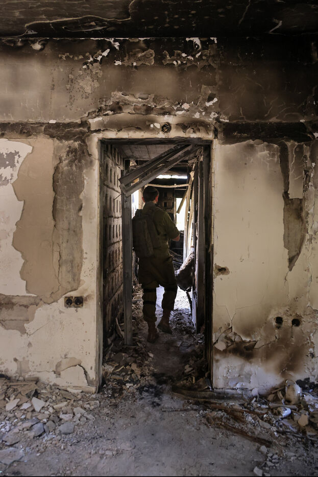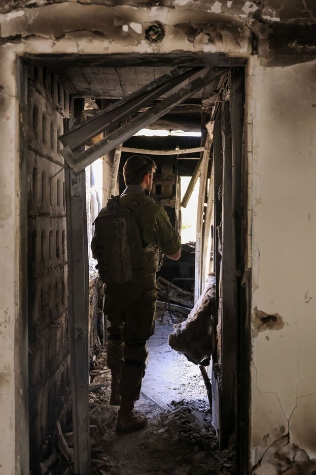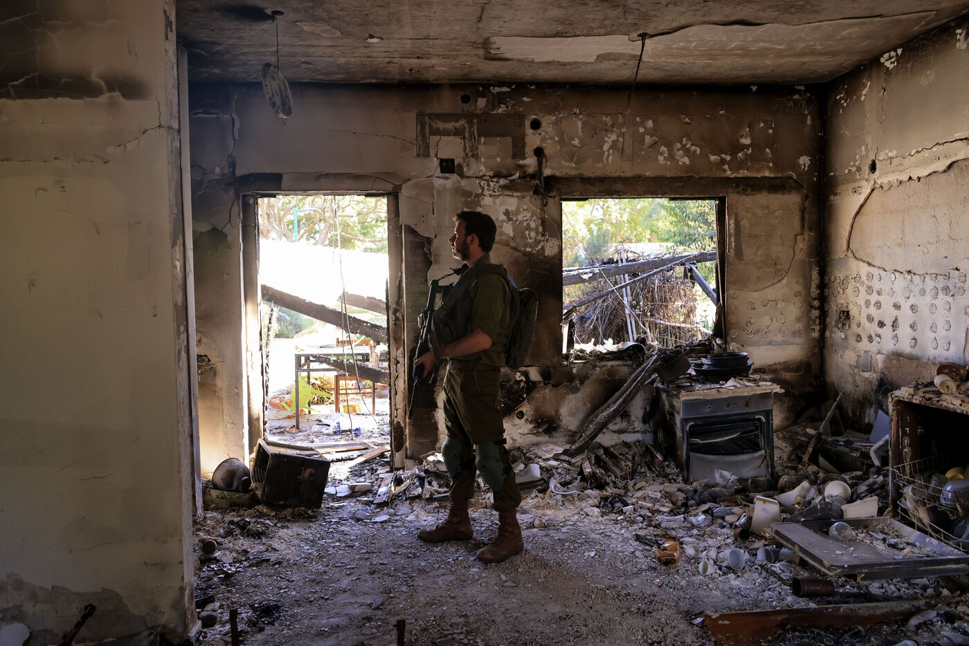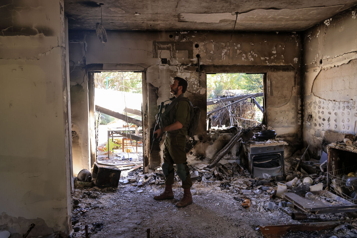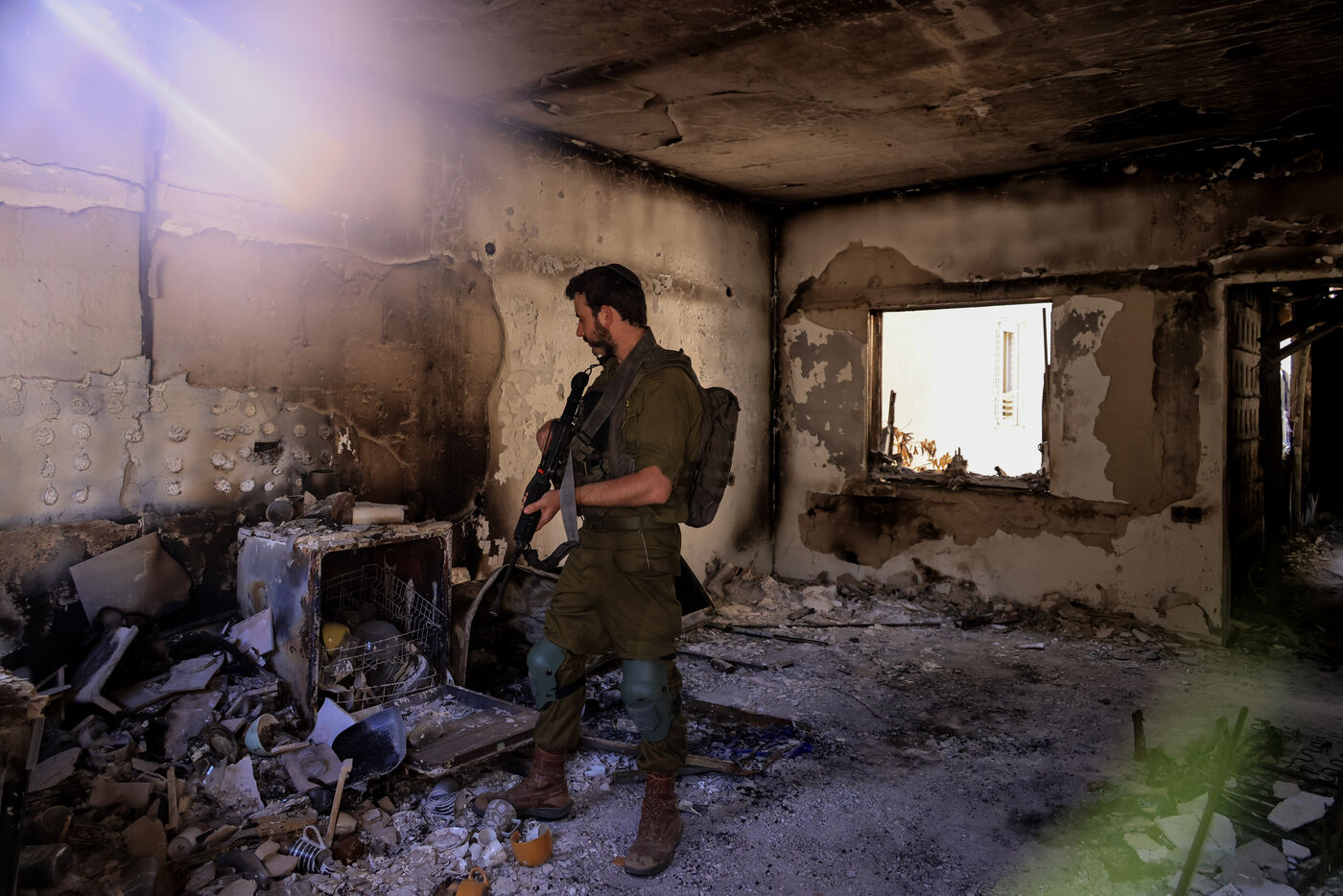 Un soldat dans une maison endommagee dans le kibboutz Nir Oz, pres de la bande de Gaza, attaque le 7 octobre par des militant du Hamas, le 30 octobre 2023.