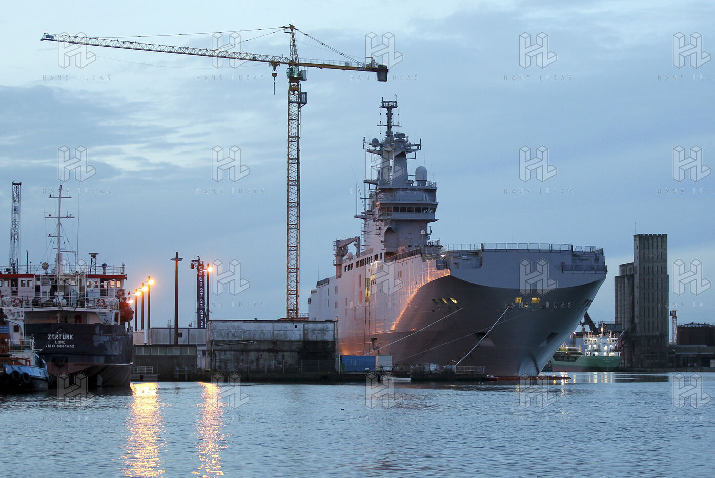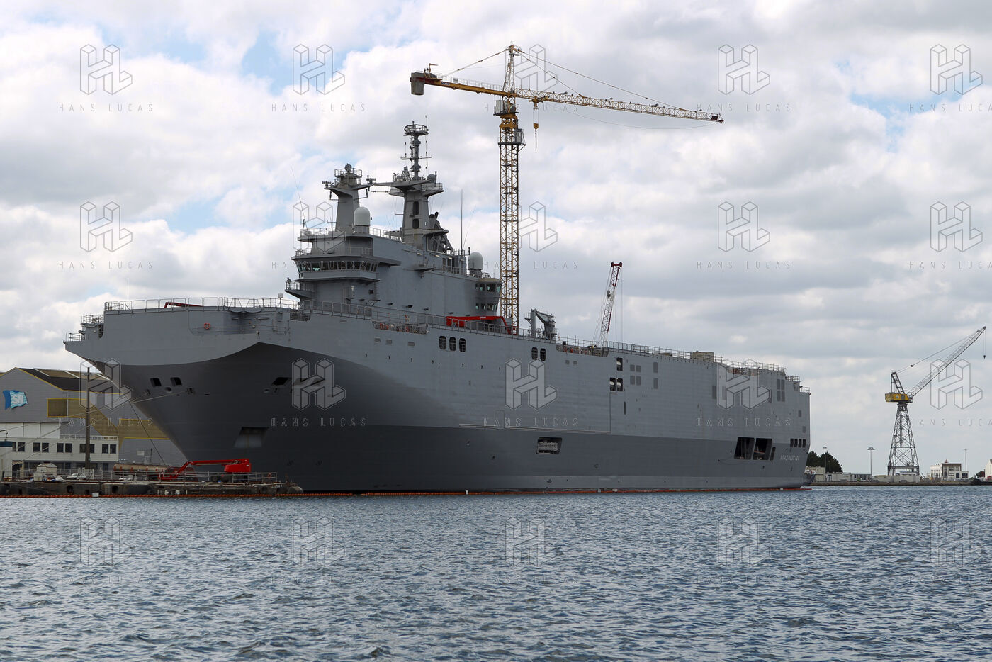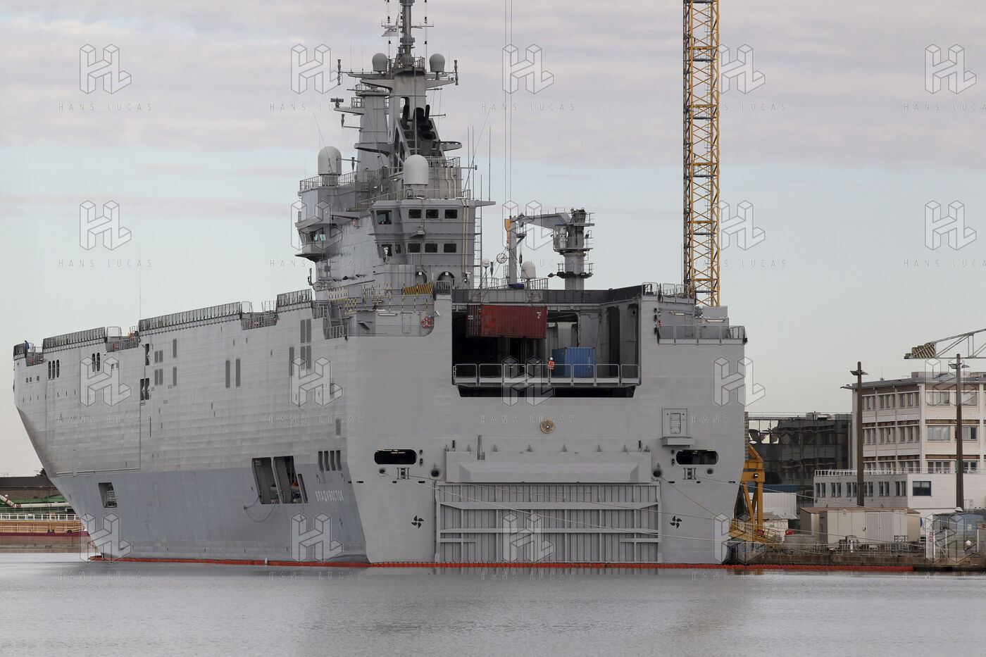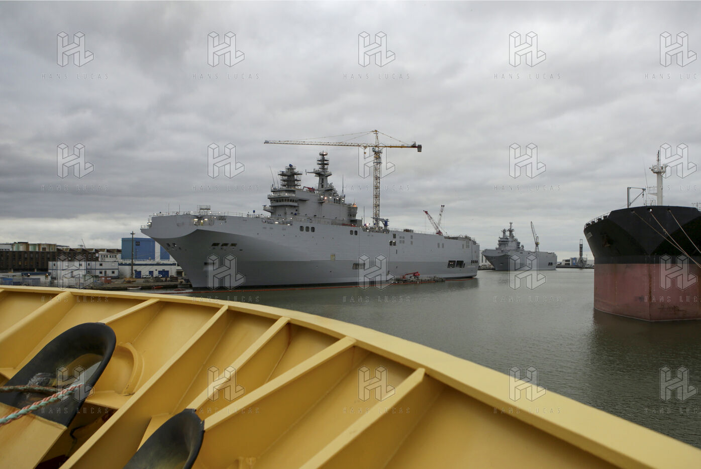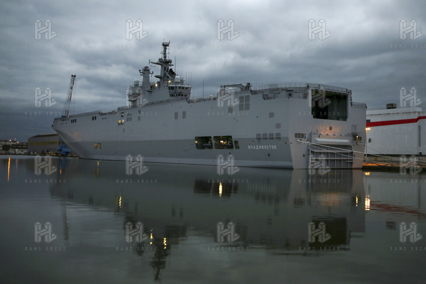 Le navire de guerre Vladivostok, porte-helicopteres de classe Mistral commande par la Russie, est a quai dans les chantiers navals STX France a Saint-Nazaire.